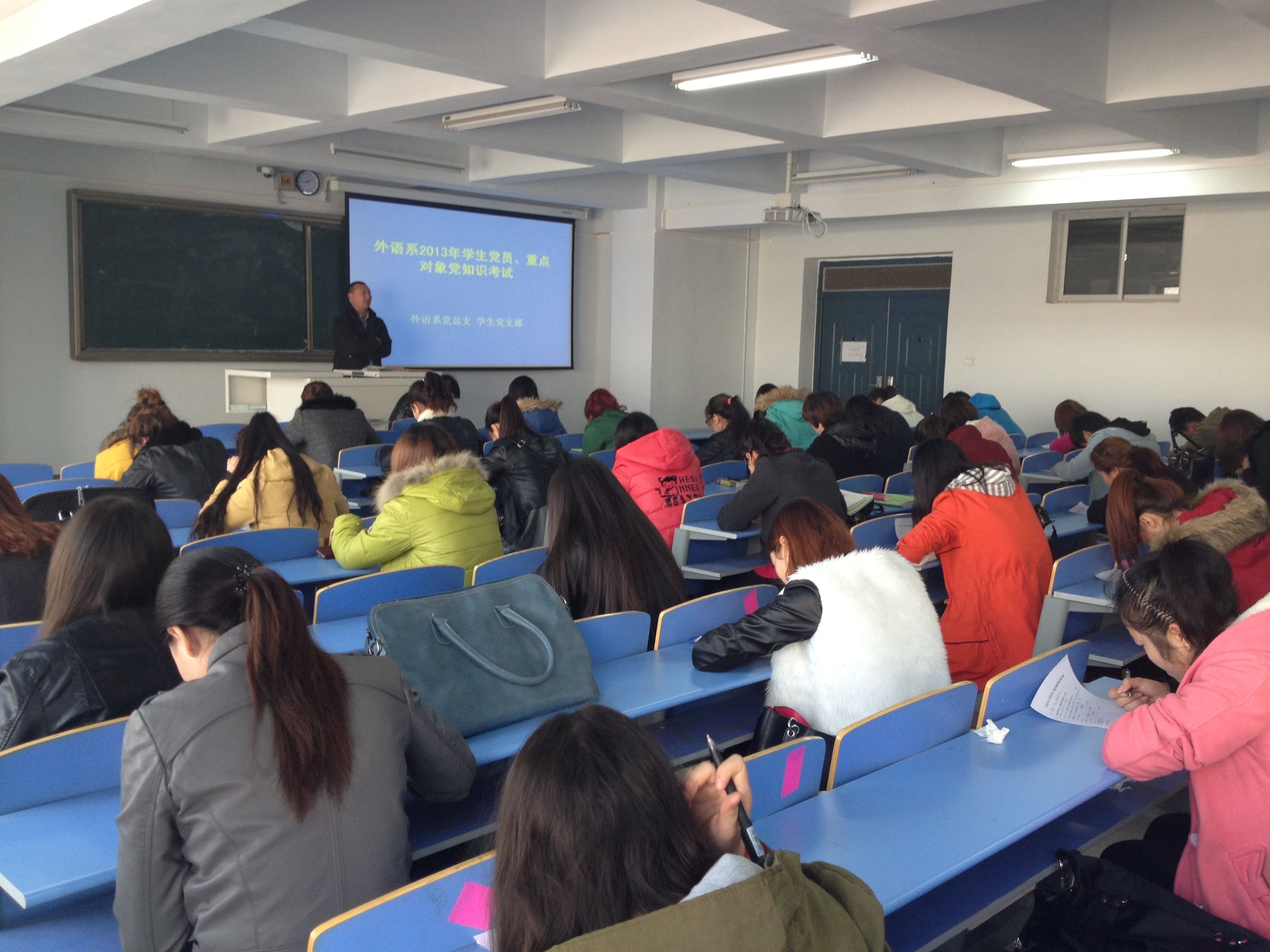 为了检验学生党员、重点培养理论知识的学习水平,2013年11月5日中午,外语系学生党支部在新教学楼618教室组织学生党员、重点对象共80人进行了理论考试。