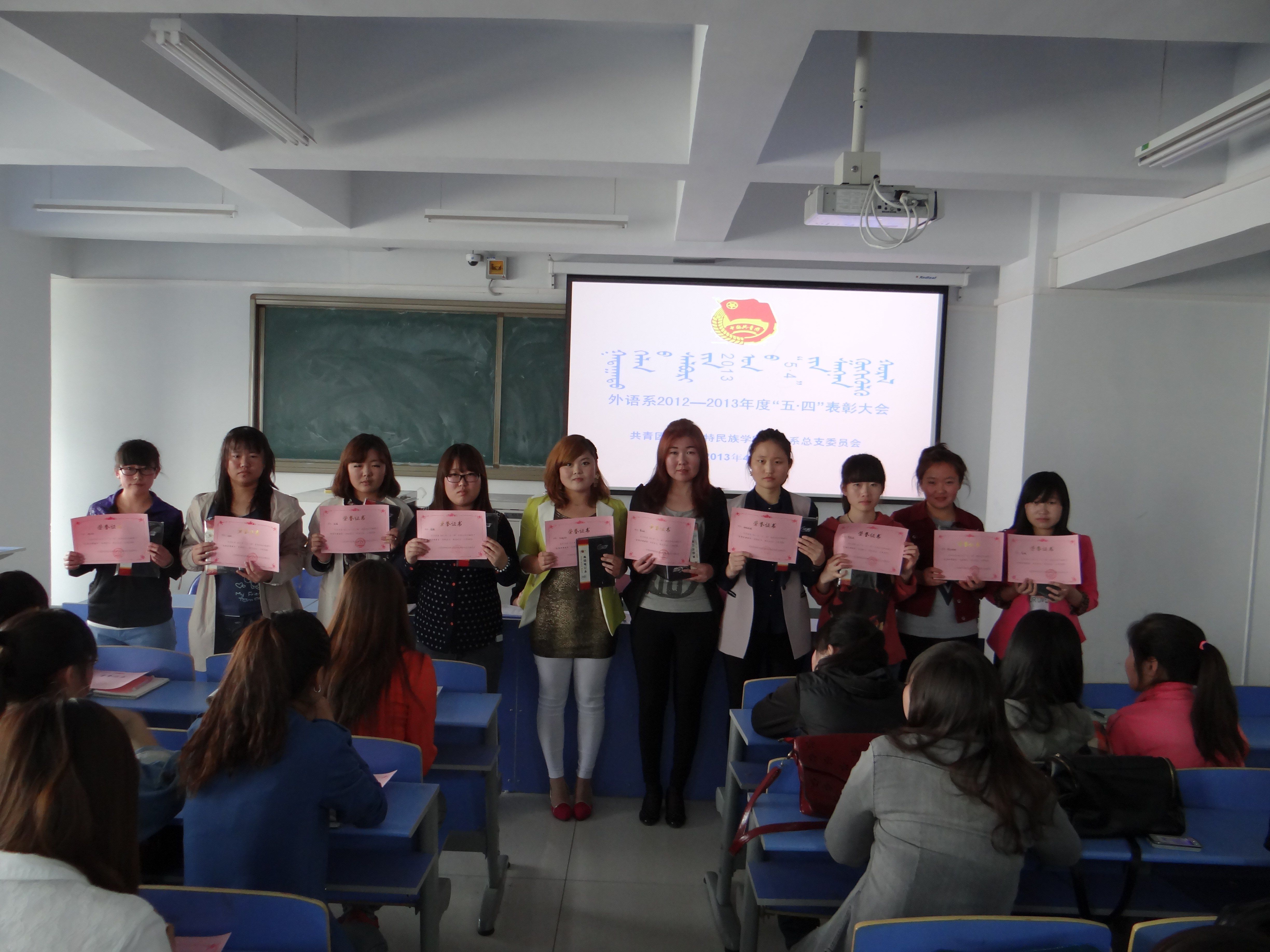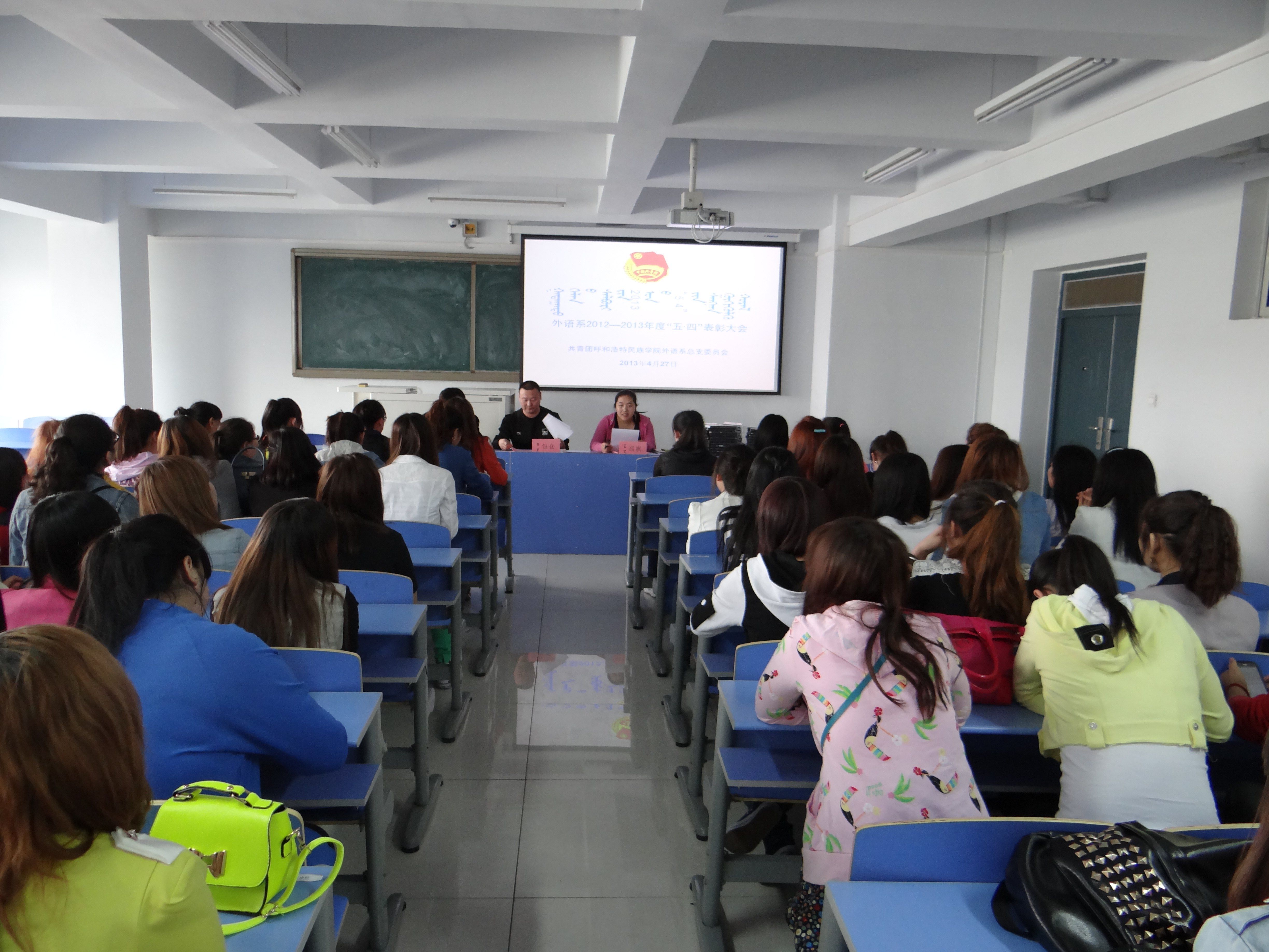 2013年4月27日下午,外语系2013年“五四”表彰大会在新教学楼618教室举行。外语系副主任苏日嘎拉图教授、团总支书记包仓、团总支助理高帆以及学生代表出席了本次大会。