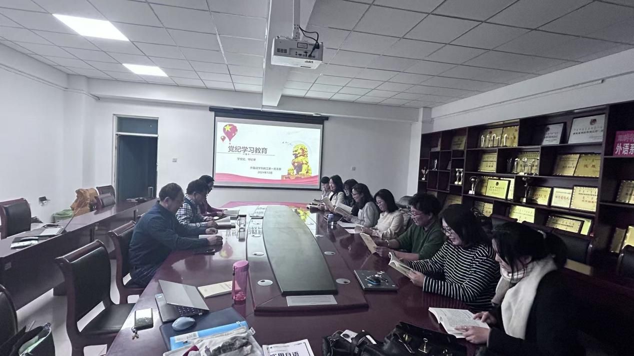 12月5日,外国语学院教工第一党支部在学院会议室举行了党纪学习教育活动。本次活动旨在加强党员教师的党性修养,提升政治素质,确保党的纪律和规矩在教育工作中得到切实执行。