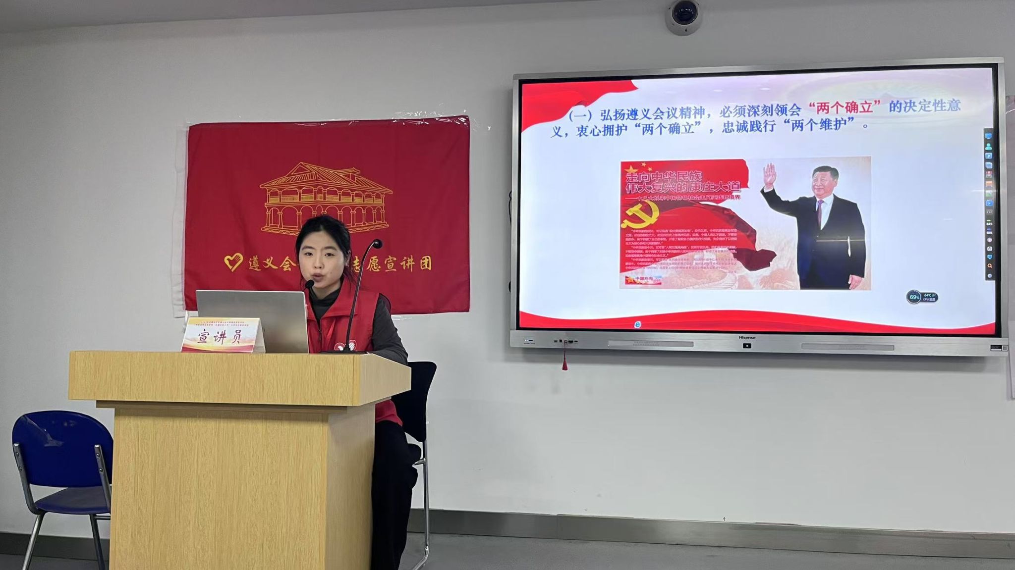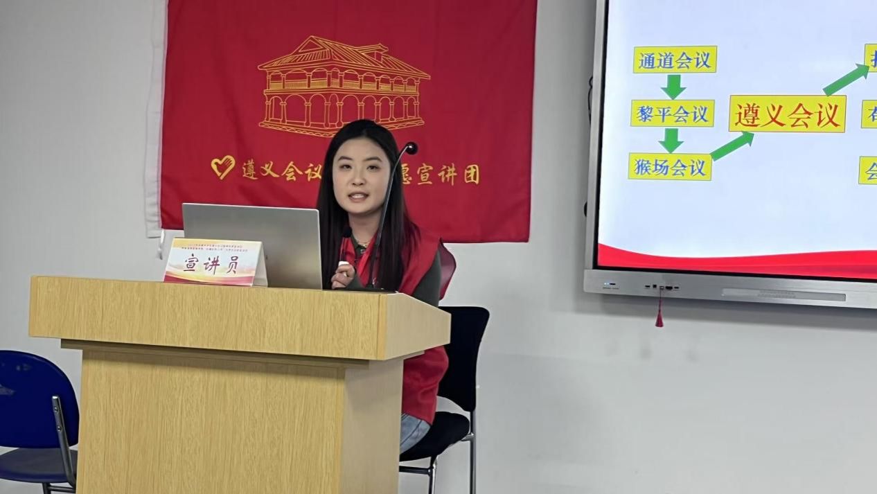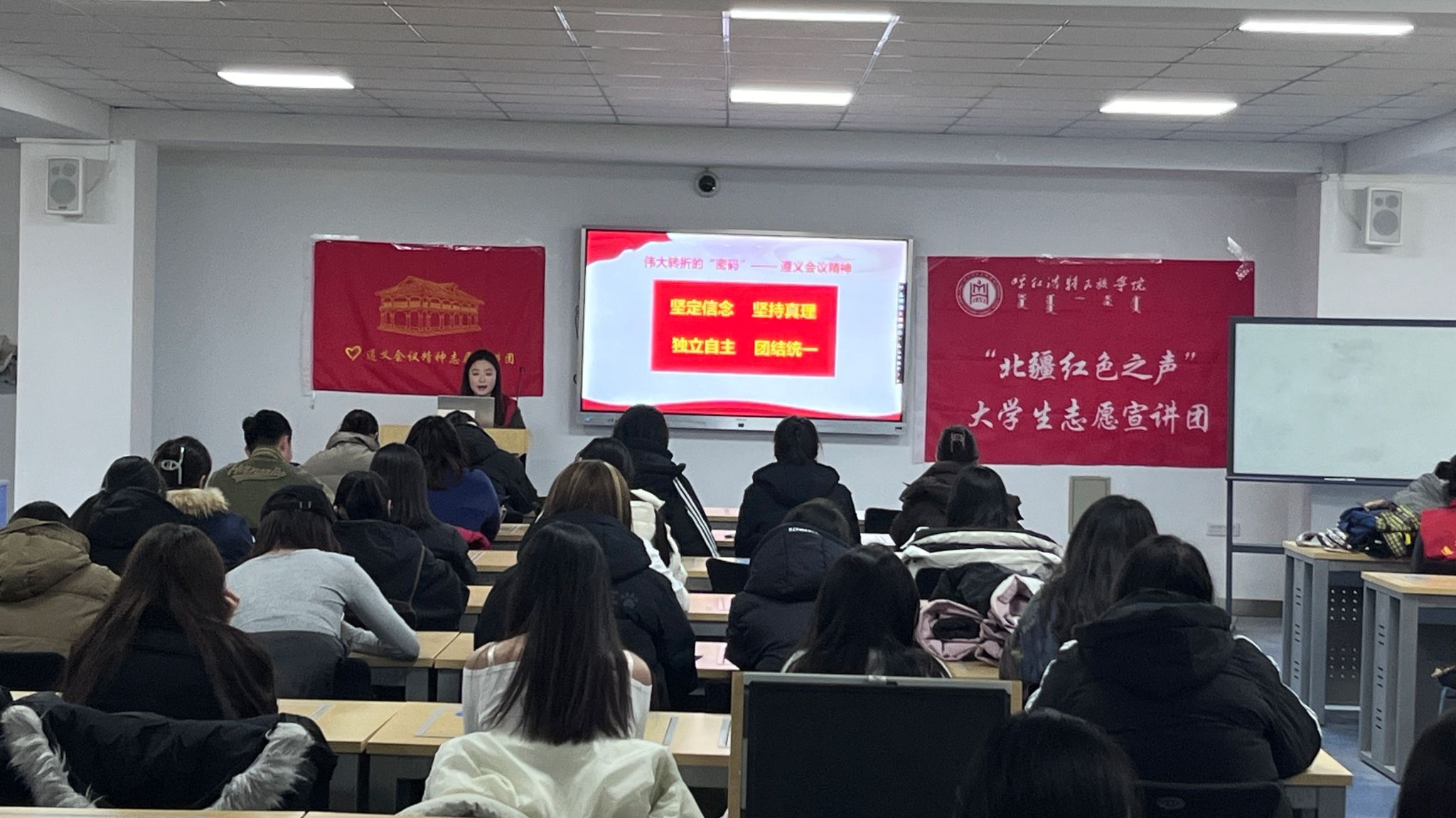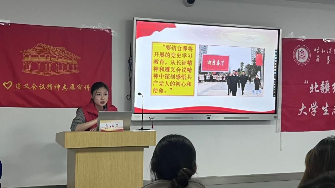 活动伊始,宣讲团团长黄卫秀向与会同学详细介绍了“北疆红色之声”大学生志愿宣讲团的成立背景、成员构成以及宣讲目的,让大家对宣讲团有了更加全面和深入的了解。随后,现场播放了“遵义会议纪念馆宣传视频”,通过生动的画面和详实的解说,将学生们带入了那段波澜壮阔的历史岁月。