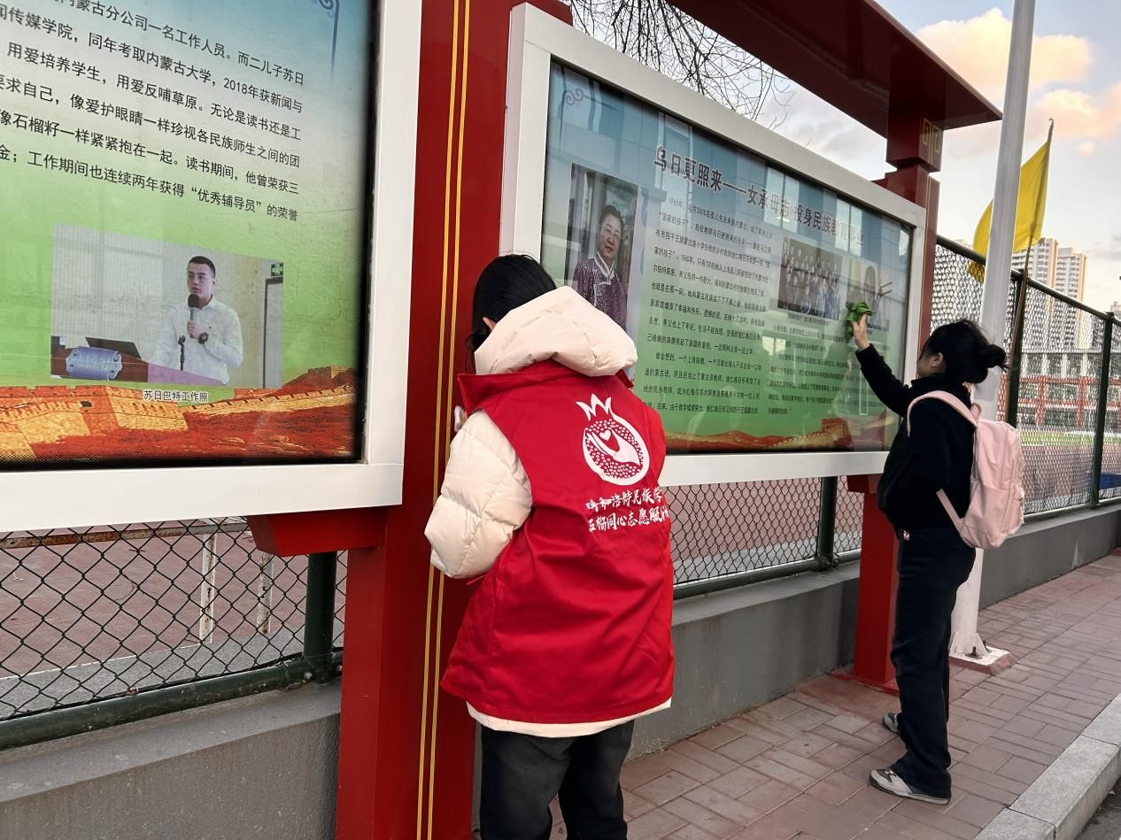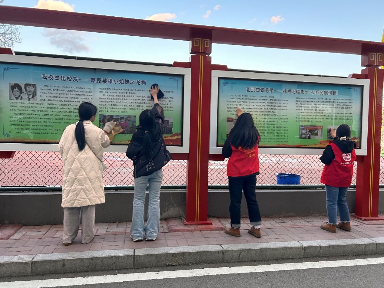 活动前夕,两个党支部的全体学生党员积极响应号召,认真筹备,确保活动顺利进行。活动当天,党员们准时集合于学校民族团结进步文化长廊,身着红色志愿者马甲,手持清洁工具,以饱满的热情投入到清洁工作中。在活动中,党员们分工明确,协作有序对全部橱窗进行全方位、无死角擦拭。尽管任务繁重,但党员们发扬不怕脏、不怕累的精神,用实际行动展现了党员的风采。