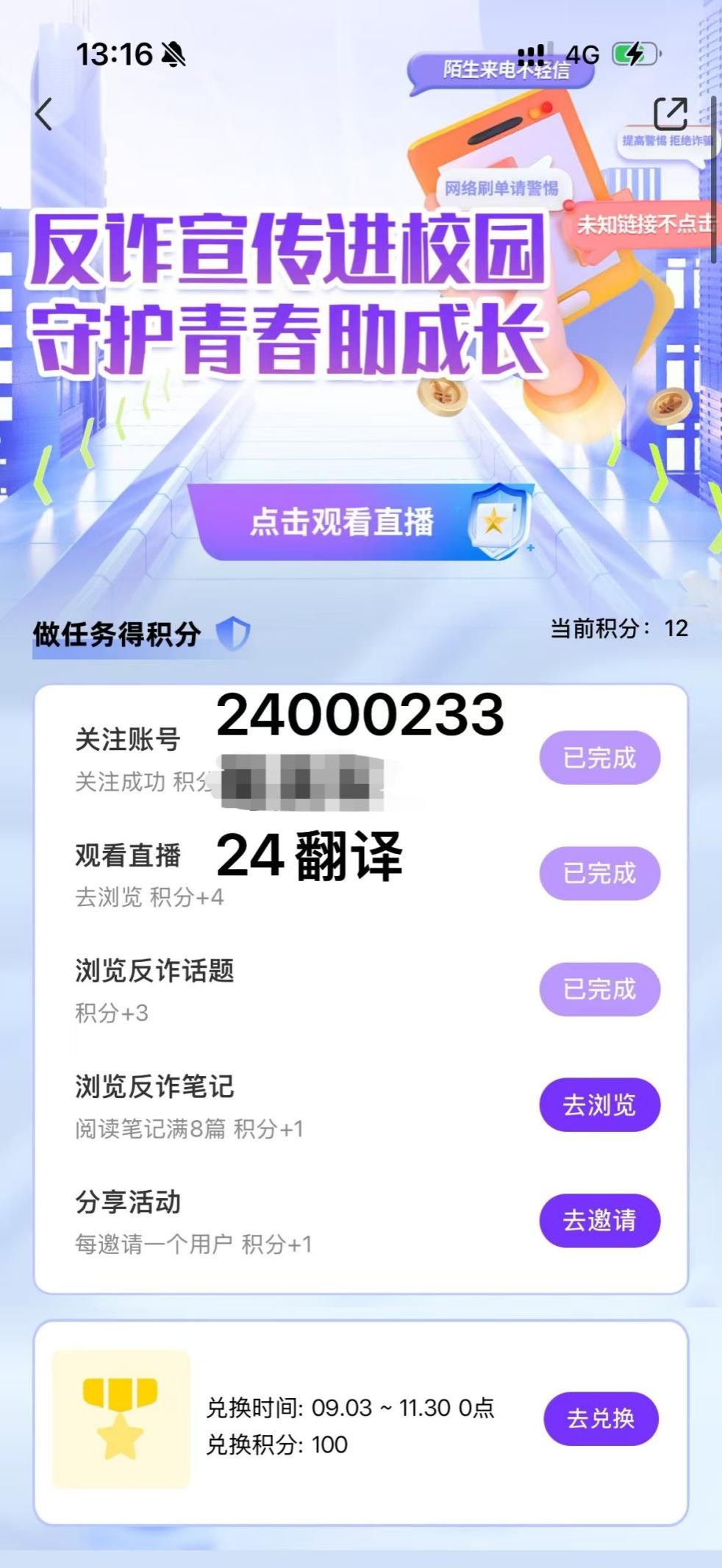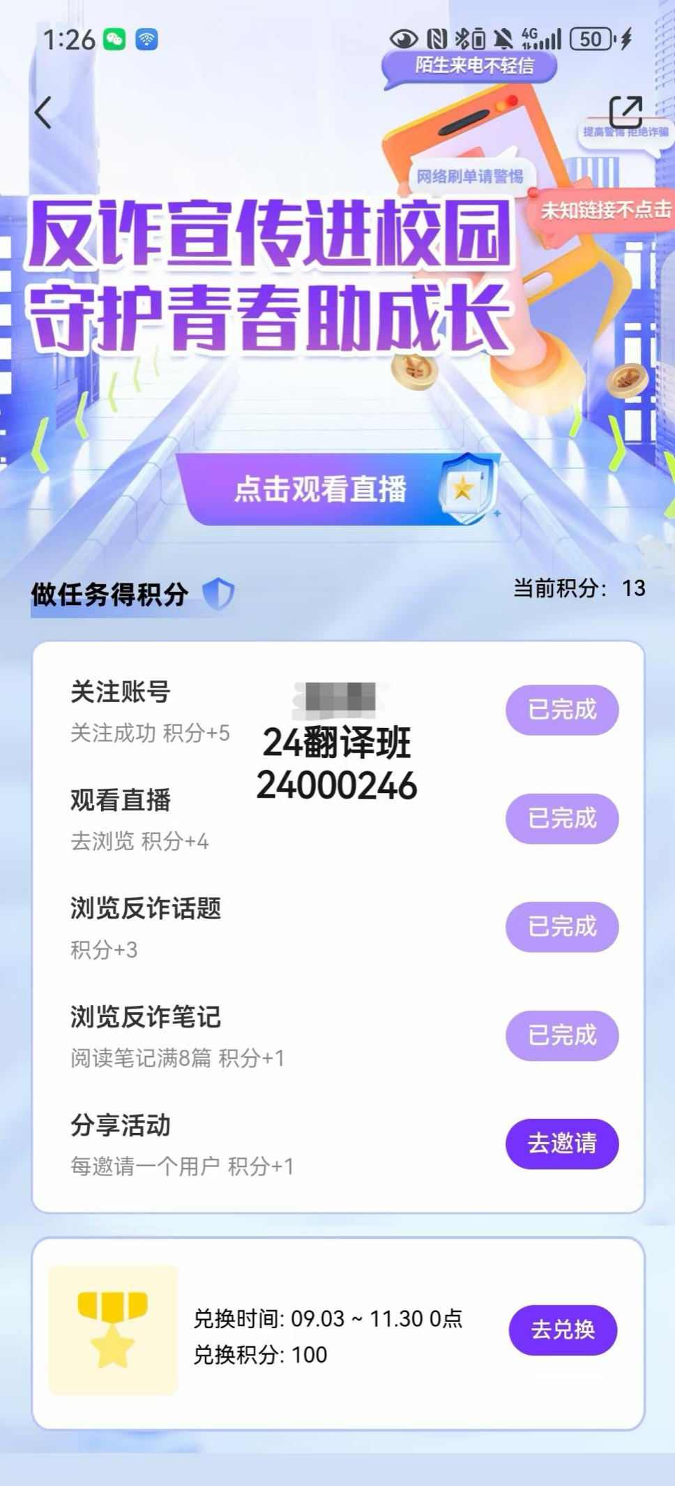 据统计,我院打卡情况十分良好,众多学子主动参与其中,将反诈学习融入日常。这种积极的参与度不仅反映出大家对反诈知识的重视,更彰显了我院学子在守护自身财产安全、维护校园安全环境方面的责任感。同学们在打卡互动中,既提升了自身的反诈能力,又以实际行动成为了反诈宣传的“青年使者”,为构建平安校园、守护青春成长贡献了自己的力量。