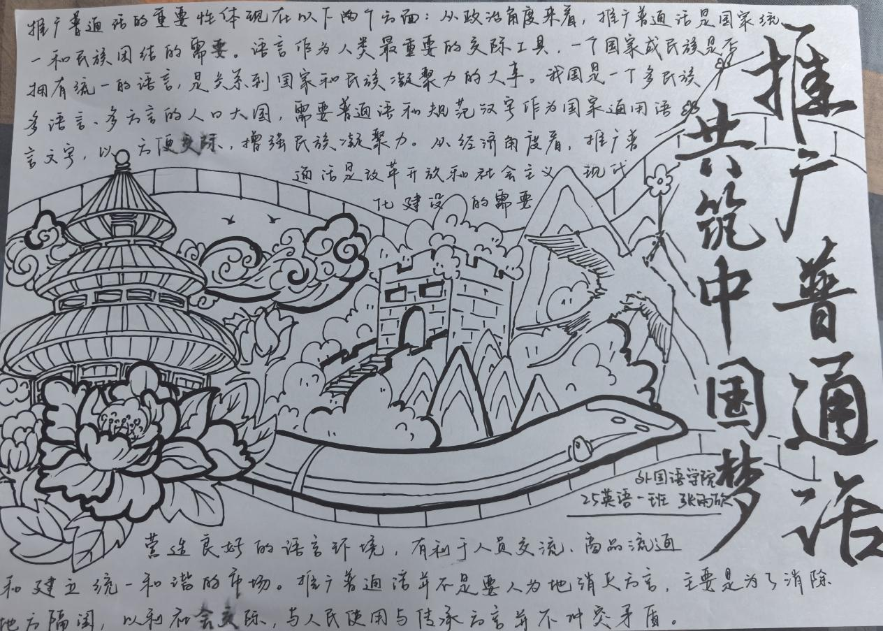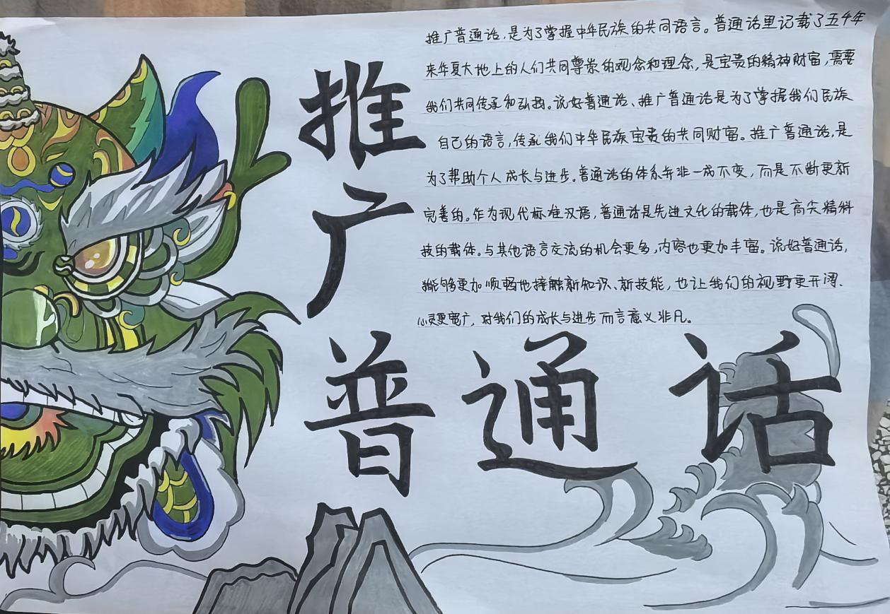 活动开展过程中,同学们踊跃参与。同学们围绕主题,精心构思、巧妙设计,将对普通话的理解与对中国梦的憧憬融入笔尖。作品内容丰富多样,有的通过生动的漫画讲述普通话在日常交流中的重要性;有的以文字阐述普通话作为文化桥梁,凝聚实现中国梦的力量;还有的结合历史与现实,展现普通话从推广到普及,见证国家发展与民族复兴的历程。在设计上,同学们运用色彩搭配、版面布局等技巧,让每一份手抄报既富有知识性,又具备较强的视觉冲击力,充分展现了新时代学生的创造力与使命感。