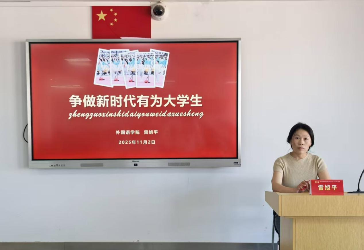 为引导青年学子坚定理想信念、勇担时代使命,11月2日,外国语学院团总支书记雷旭平为学院2025年“青马班”学员讲授题为《争做新时代有为大学生》的培训第一课。