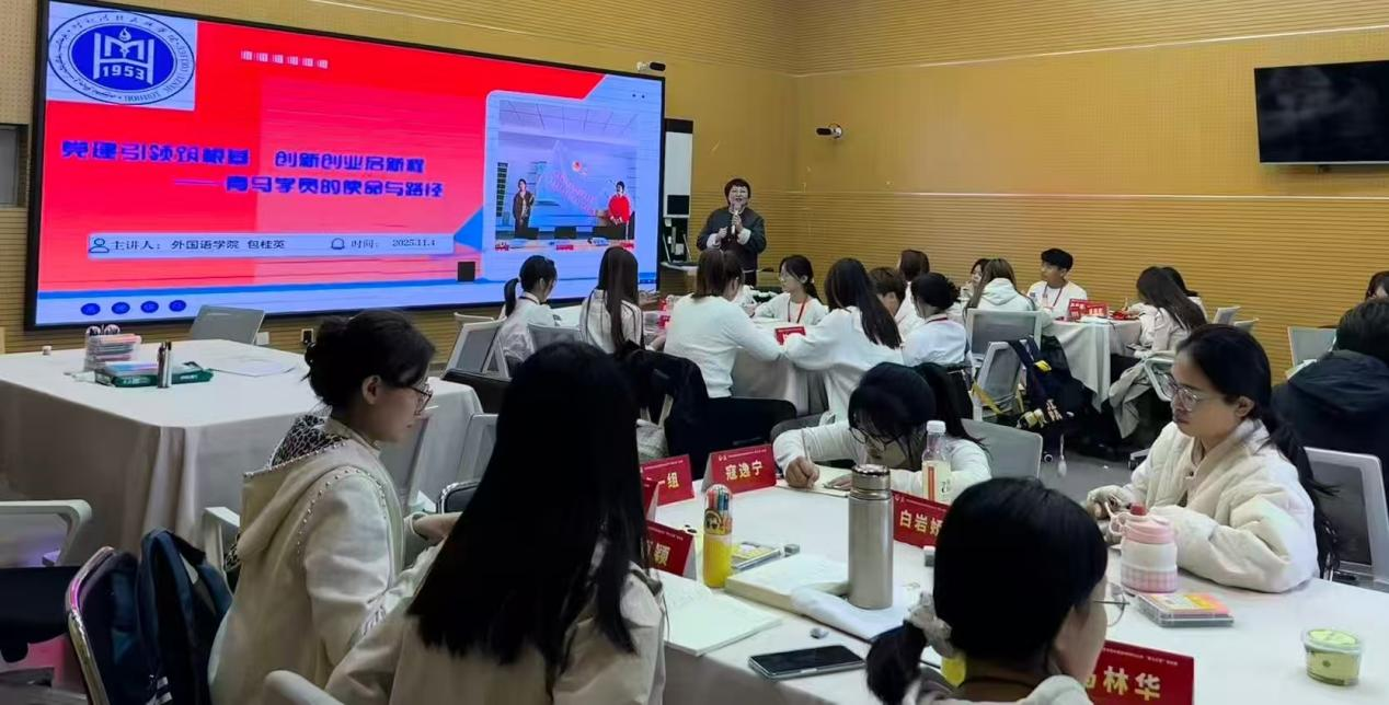 为锚定青马工程核心定位,强化外国语专业学子理论铸魂与价值引领,筑牢理想信念根基,11月4日,外国语学院党总支副书记包桂英为学院2025年“青马班”学员讲授题为《党建引领筑根基 创新创业启新程——青马学员的使命与路径》的培训第三课。
