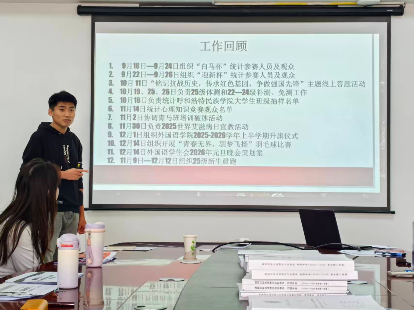 为总结本学期学生会工作成果,明晰后续发展方向,进一步提升学生工作质量,外国语学院学生会述职大会于12月19日12:30在都林楼611举行。外国语学院团总支书记雷旭平、学生会成员及社团代表出席本次大会。