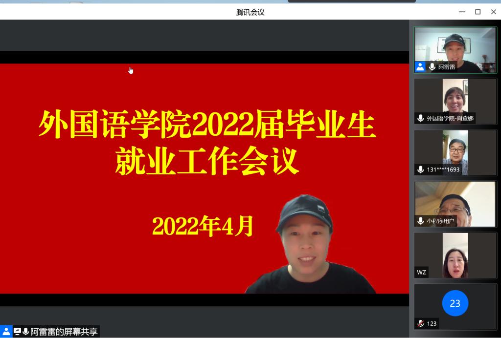 为全面推进学院毕业生就业工作,外国语学院于4月4日晚7时在腾讯会议平台召开2022届毕业生就业工作推进会议。学院党总支书记布日古德、院长肖查娜、副书记红梅、副院长陈玉红、2022届毕业班班主任、辅导员和学院全体教师参加了会议,会议由2022届毕业班辅导员雷旭平主持。