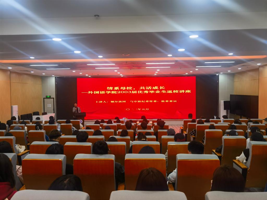 为进一步强化我院学生的职业发展教育,促进学生树立正确的就业观念、提高就业和实践的能力,值此喜迎校庆70周年之际,外国语学院于5月6日下午在北院图书馆一楼报告厅举办“情系母校,共话成长”高效就业专题分享会。本次分享会特邀请学院2003届优秀毕业生额尔敦图主讲,学院领导班子、2023届毕业生和2020级学生代表、班主任、辅导员共计150余人现场聆听。