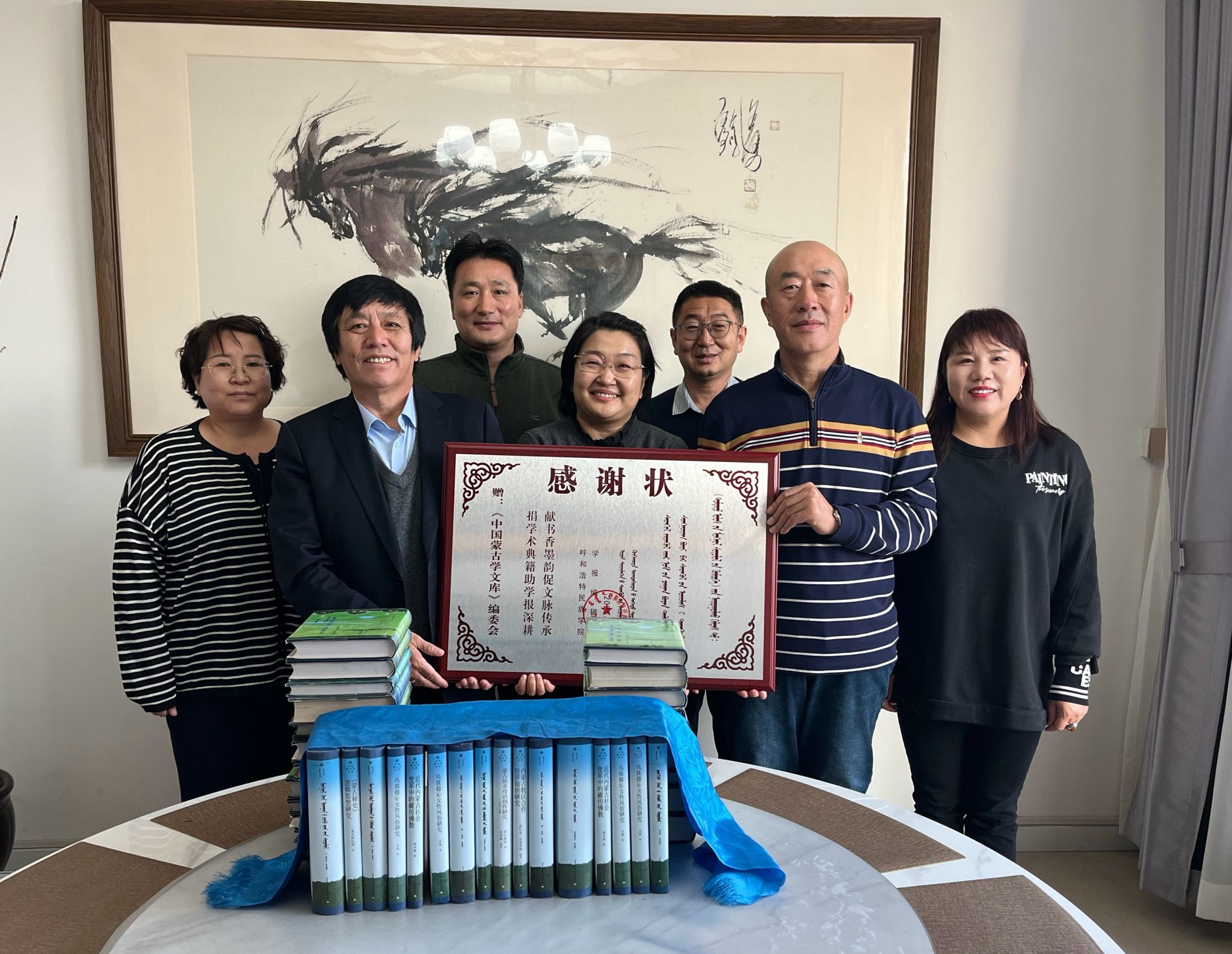 2025年11月3日,学报编辑部收到了《中国蒙古学文库》编委会赠送的《中国蒙古学文库》两批丛书,总计200册专著。《中国蒙古学文库》编委会的负责人和学报编辑们共同参与此次捐书活动。编辑部主任富涛接受了赠书,并对《中国蒙古学文库》编委会的慷慨捐赠表达了诚挚的感谢。这两批丛书是由《中国蒙古学文库》编委会编辑出版,汇集了蒙古学领域近20多年来的多项重要研究成果,具有极高的学术和收藏价值。