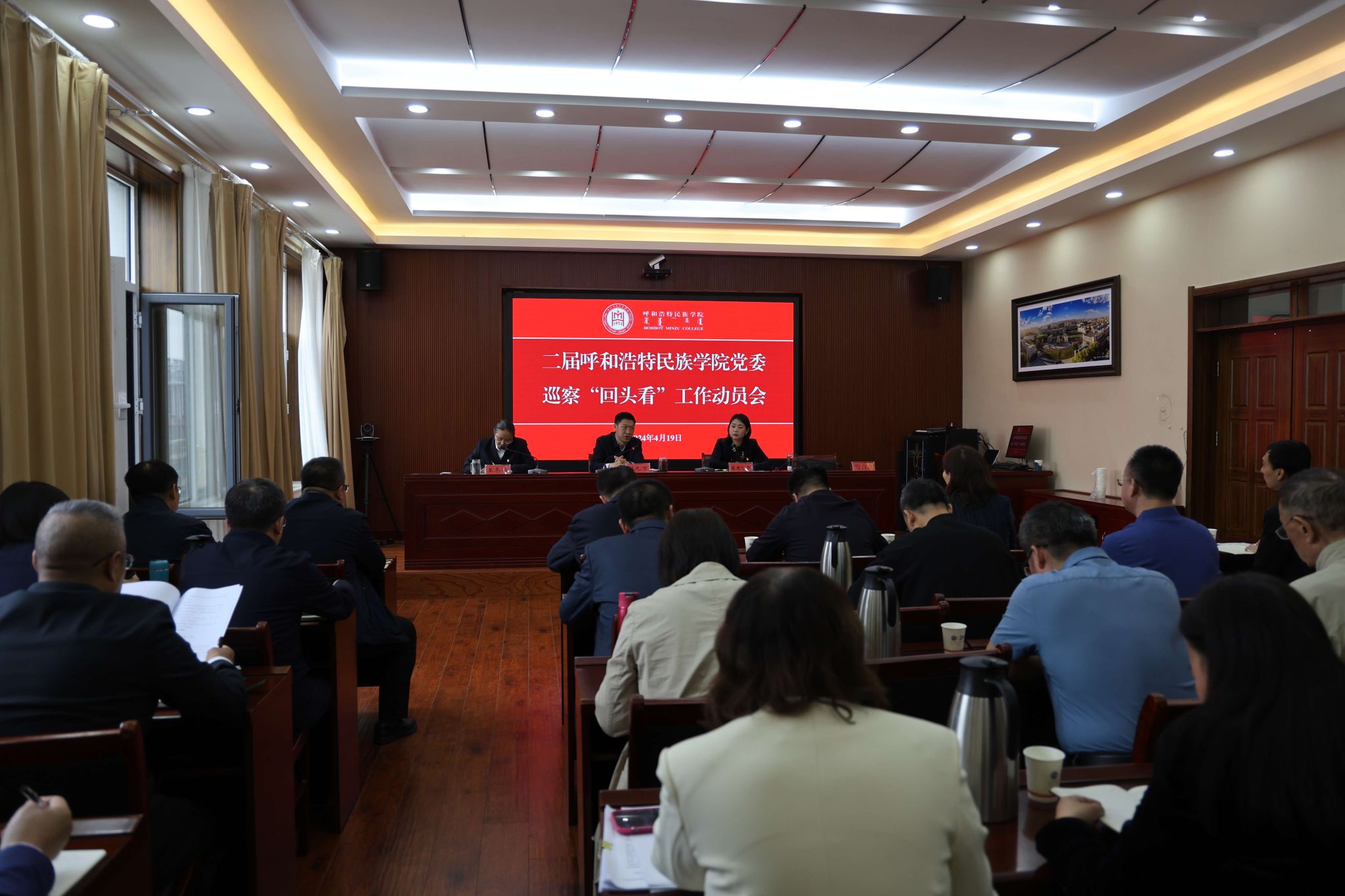 4月19日上午,学校召开二届beat365英国官方网站党委巡察“回头看”工作动员会,校党委书记、巡察工作领导小组组长刘九万出席会议并讲话。党委副书记格根哈斯出席会议。党委委员、纪委书记、监察专员王冬梅主持会议。