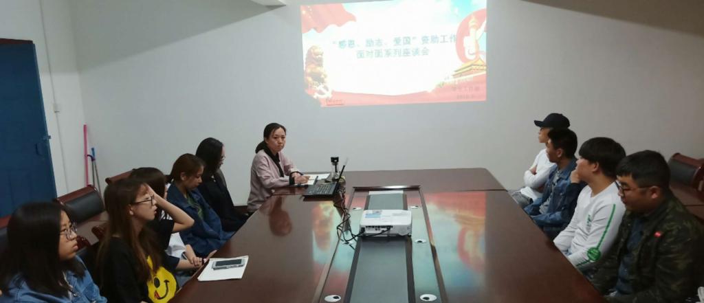 学生工作部资助中心王丽、额日和木与特困生代表召开“感恩、励志、爱国”资助座谈会,与优秀学生干部代表召开座谈会,与退伍学生代表召开座谈会。在与特困生代表深入交换意见之后,对特殊群体学生表达了深切的关心,并鼓励学生代表在今后可以通过座谈会勇于表达自己的诉求,协助学生工作部有针对性的开展工作。与优秀学生干部代表交流学习工作心得,与退伍学生代表交流部队生活,畅谈军旅生涯对自己人生的改变。