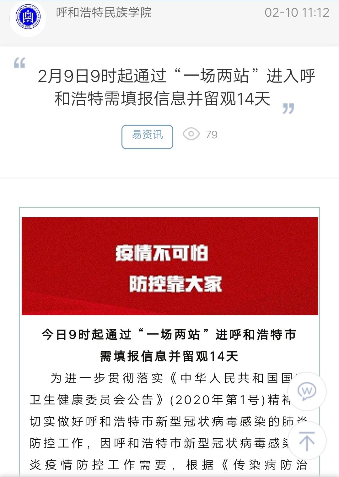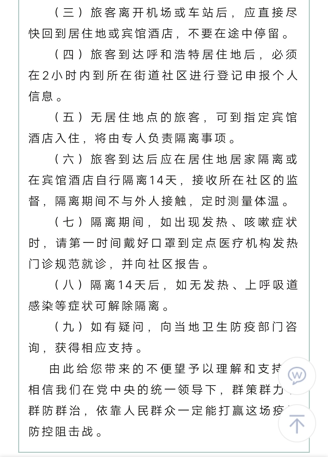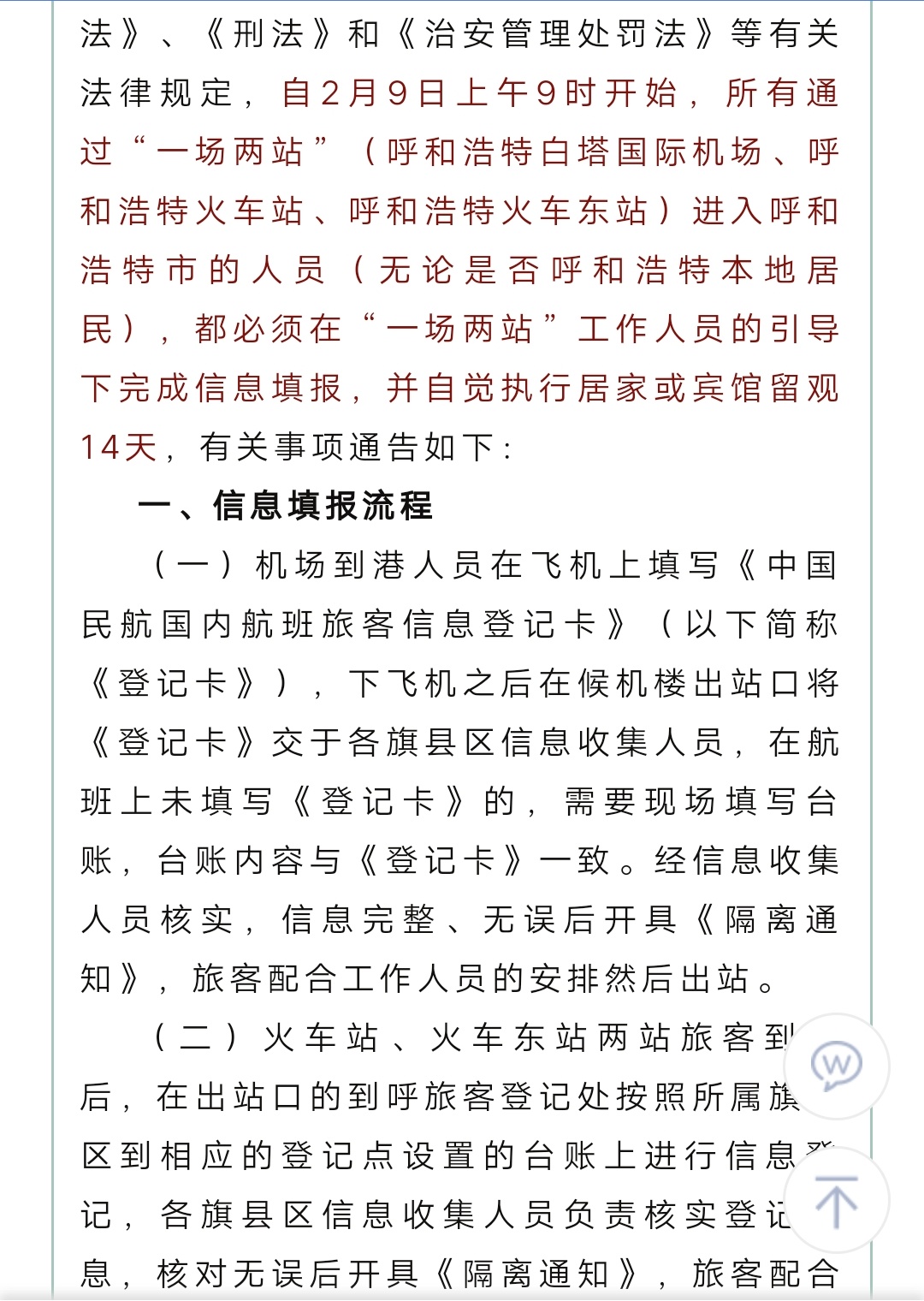 2月9日9时起通过“一场两站”进入呼和浩特需填报信息并留观14天