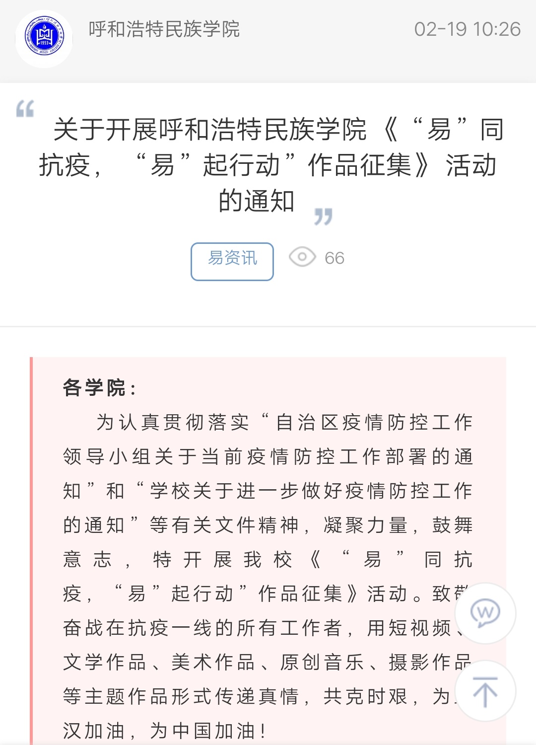 关于开展beat365英国官方网站 《“易”同抗疫, “易”起行动”作品征集》 活动的通知