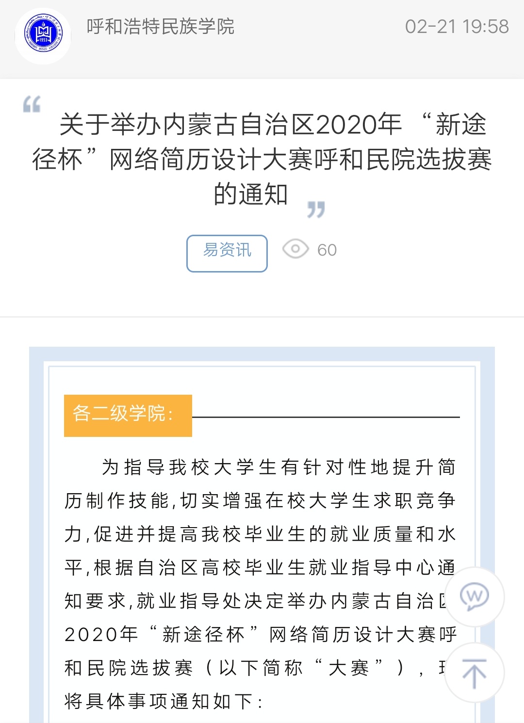 关于举办内蒙古自治区2020年“新途径杯”网络简历设计大赛呼和民院选拔赛的通知