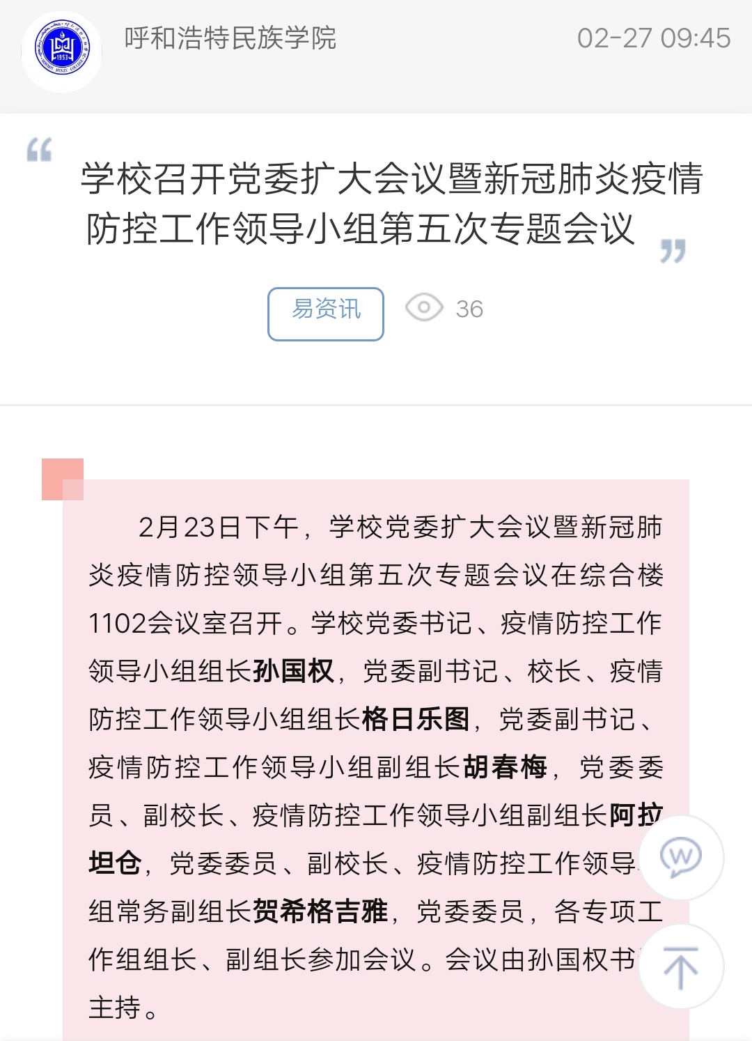 学校召开党委扩大会议暨新冠肺炎疫情防控工作领导小组第五次专题会议