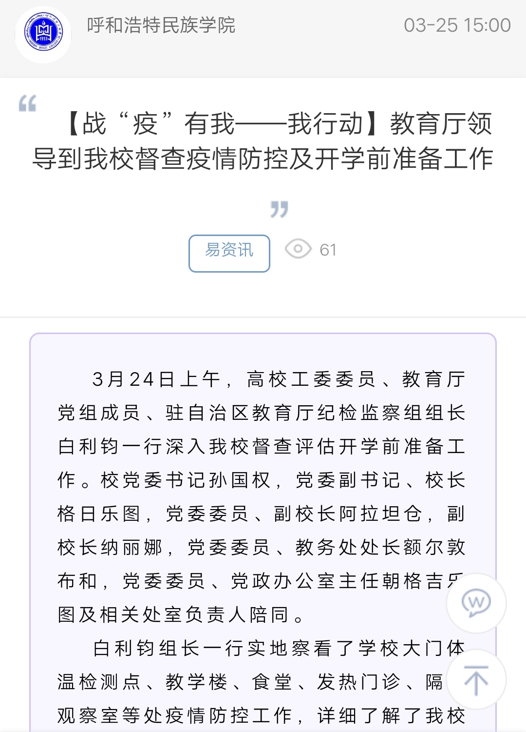 【战“疫”有我——我行动】教育厅领导到beat365官网督查疫情防控及开学前准备工作