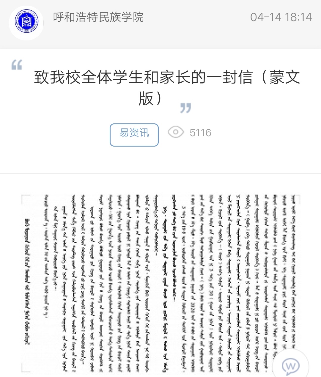 致beat365官网全体学生和家长的一封信(蒙文版)