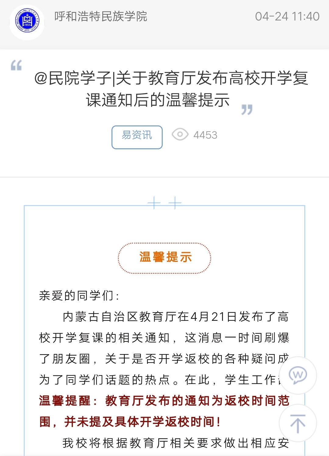 @民院学子|关于教育厅发布高校开学复课通知后的温馨提示