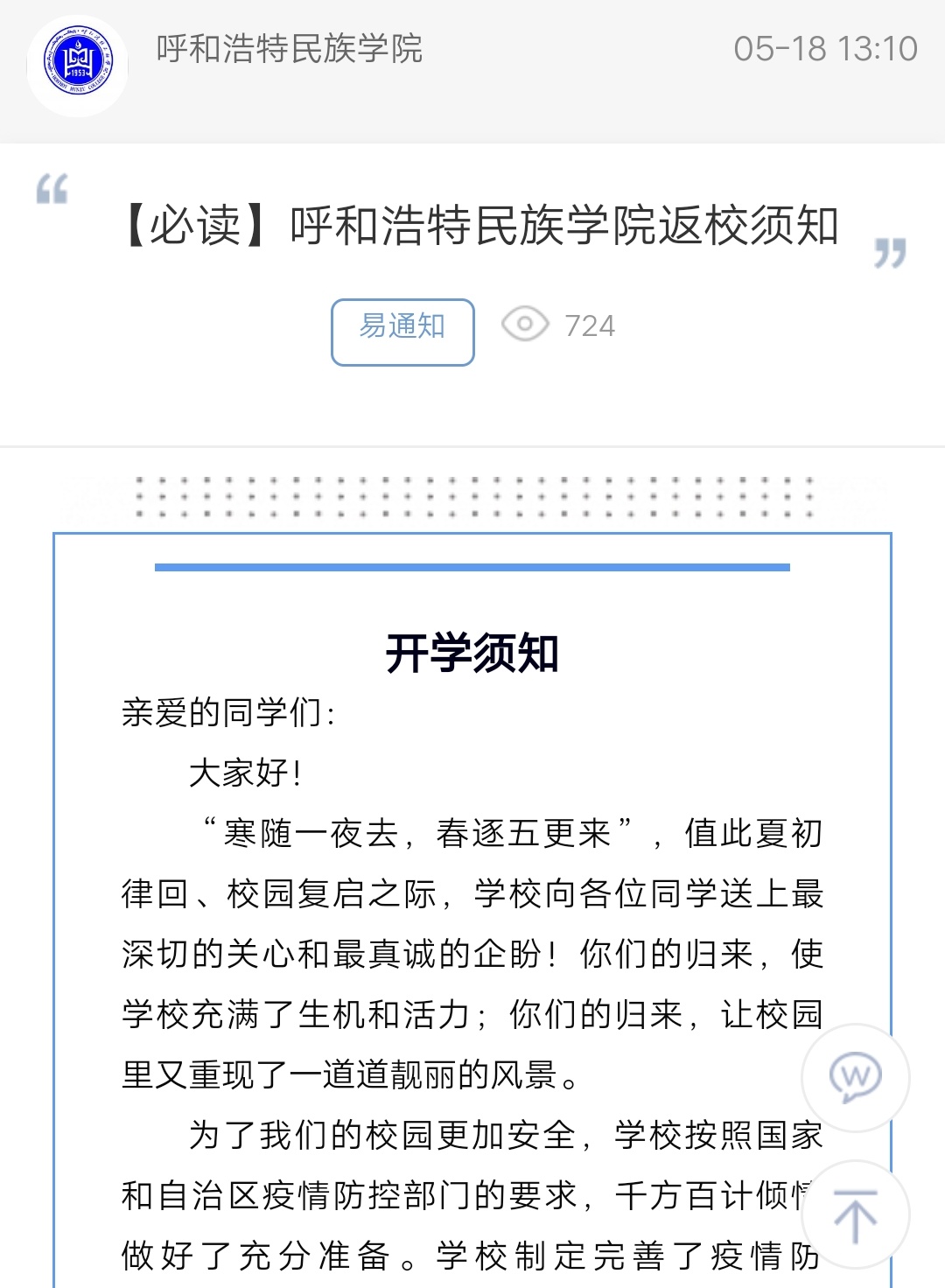 下一条:@呼民院学子 有一份返校注意事项,请查收!