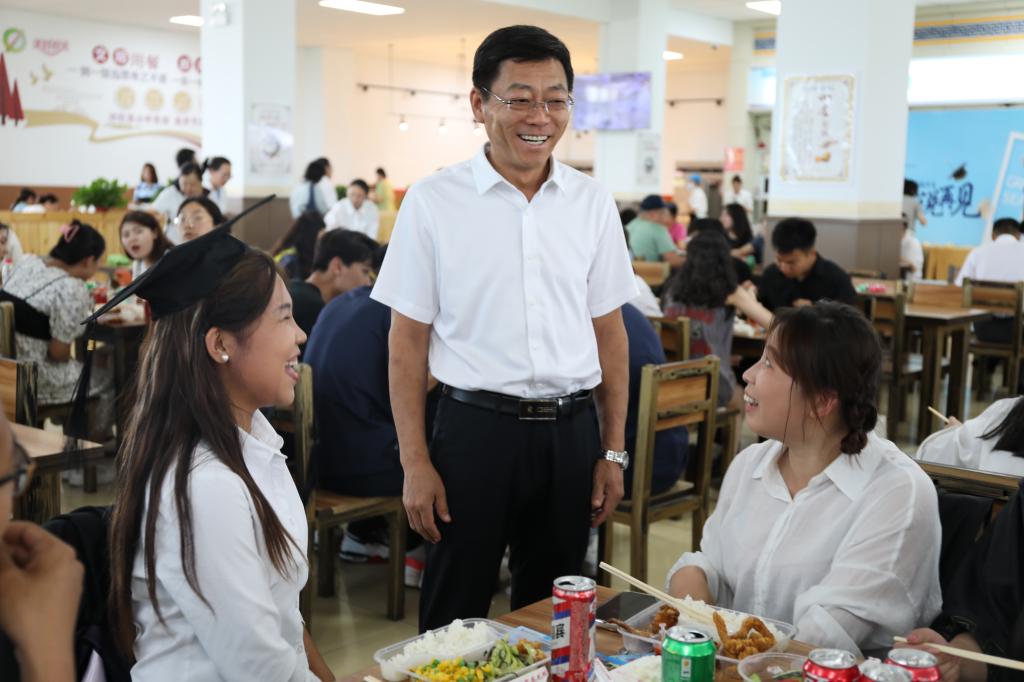 6月29日,beat365官网2023年毕业典礼和学位授予仪式结束后,后勤管理处餐饮服务中心结合主题教育,在南餐厅启动“青春不说再见”活动,为毕业生和老师们提供免费午餐,一起品味呼民院味道,以暖心的方式送别毕业生。校长韩伟新、副校长高喜天来到餐厅与毕业生共进午餐,与毕业生亲切交流,了解他们的毕业去向和职业规划。