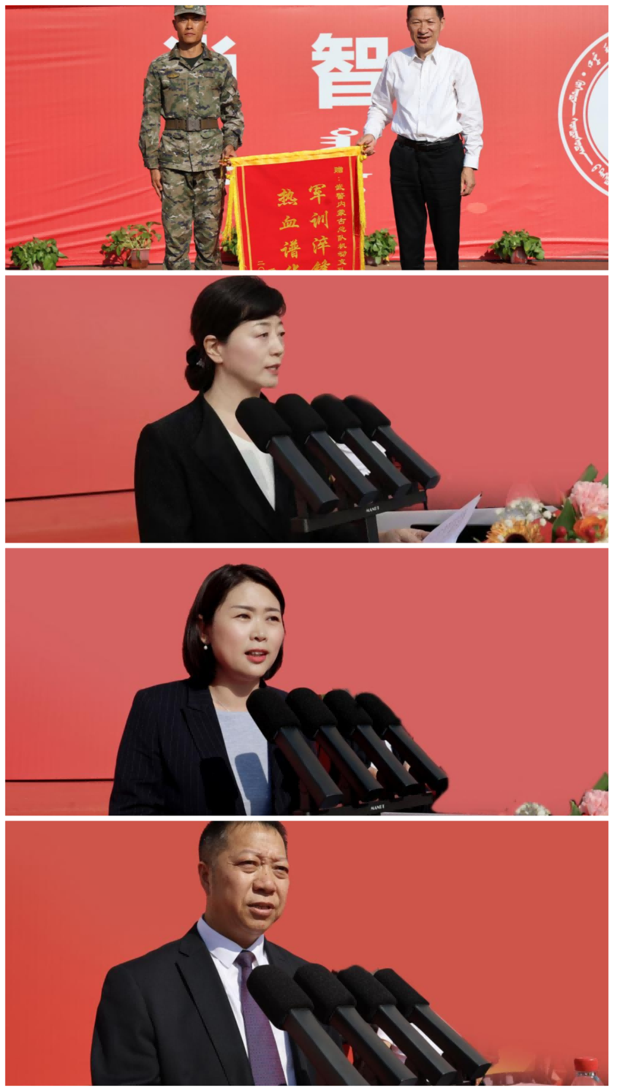 表彰先进环节,党委副书记格根哈斯宣读表彰决定,对优秀标兵、优秀教官和先进集体颁奖。主席台领导为新生代表佩戴校徽,标志着他们正式成为“民院人”。教师代表乌格德勒、在校生代表张景雯及新生代表白兴楠分别发言,共同表达“以奋斗践行强国有我”的决心。