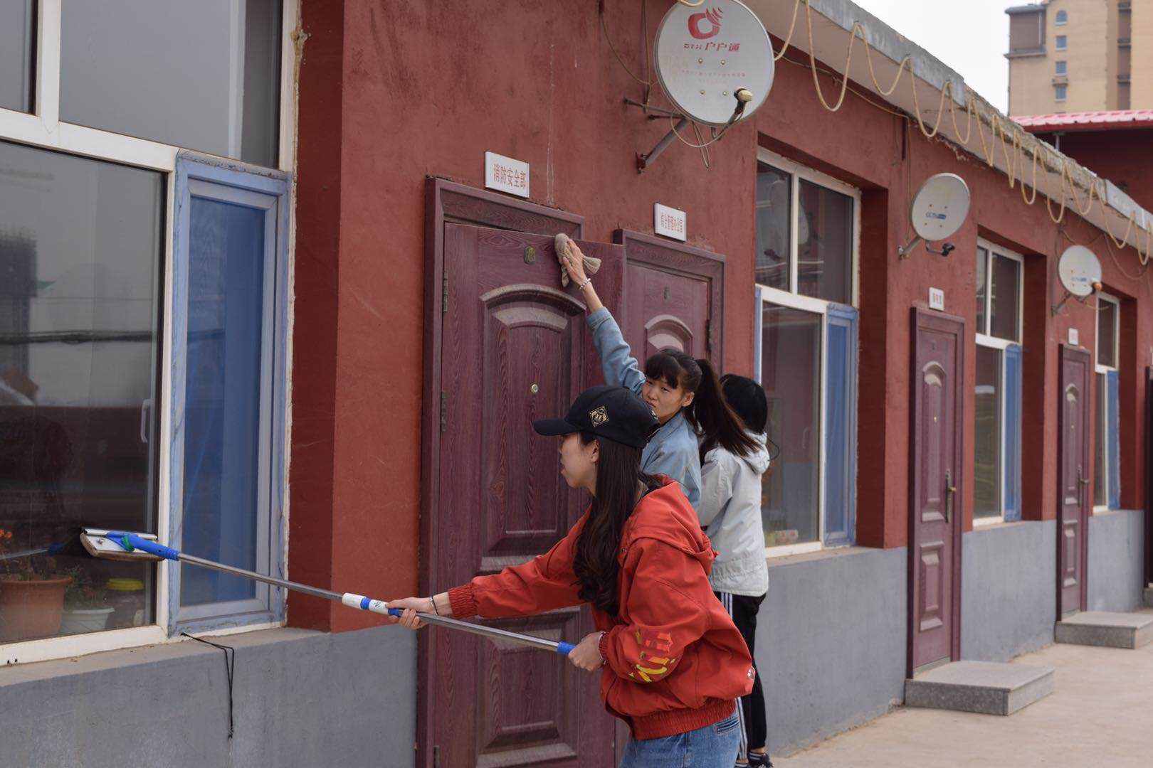 美术系学生志愿者在攸攸板镇敬老院,相互配合擦窗户、扫地、拖地、清理垃圾,陪老人聊天,用自己的劳动为敬老院的老人们创造一个更加干净、卫生、优美的生活环境。