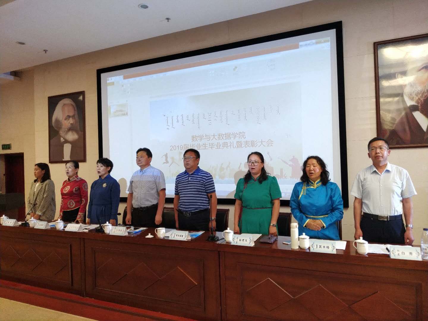 2019年6月12日,数学与大数据学院2019届毕业生毕业典礼暨表彰大会在图书馆一楼报告厅举行。数学与大数据学院党总支书记布和朝鲁、党总支副书记郝喜凤、副院长王海清、副院长额尔敦其其格、办公室主任乌云其其格、小学数学教育教研室主任其木格、经济数学教研室主任白秀及班主任、任课老师、学生代表参加了本次大会。会议由辅导员金玲老师主持。
