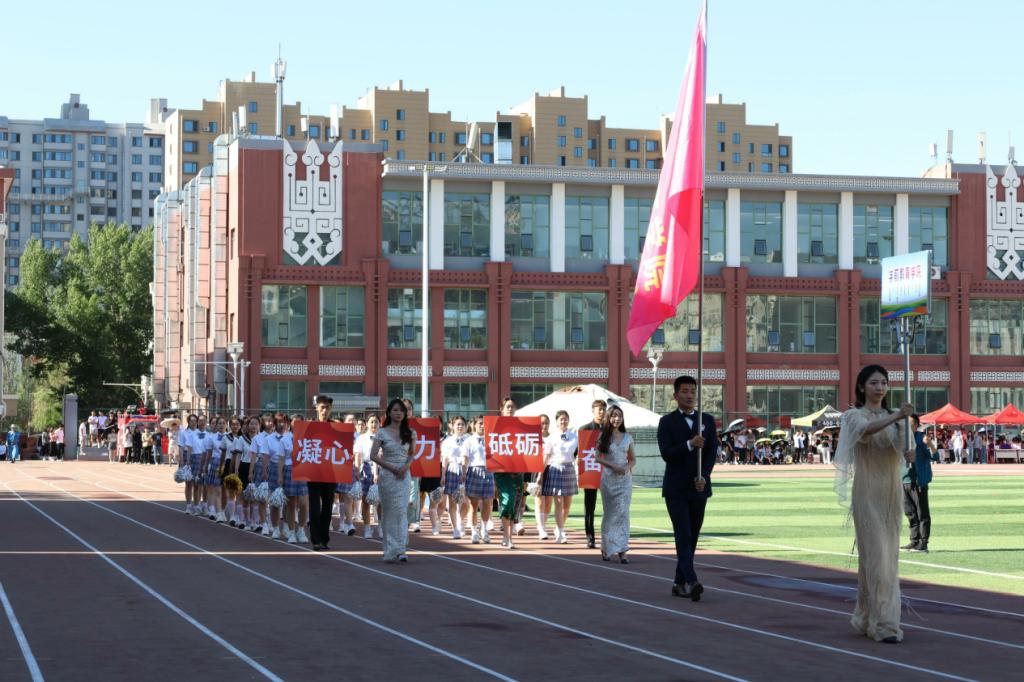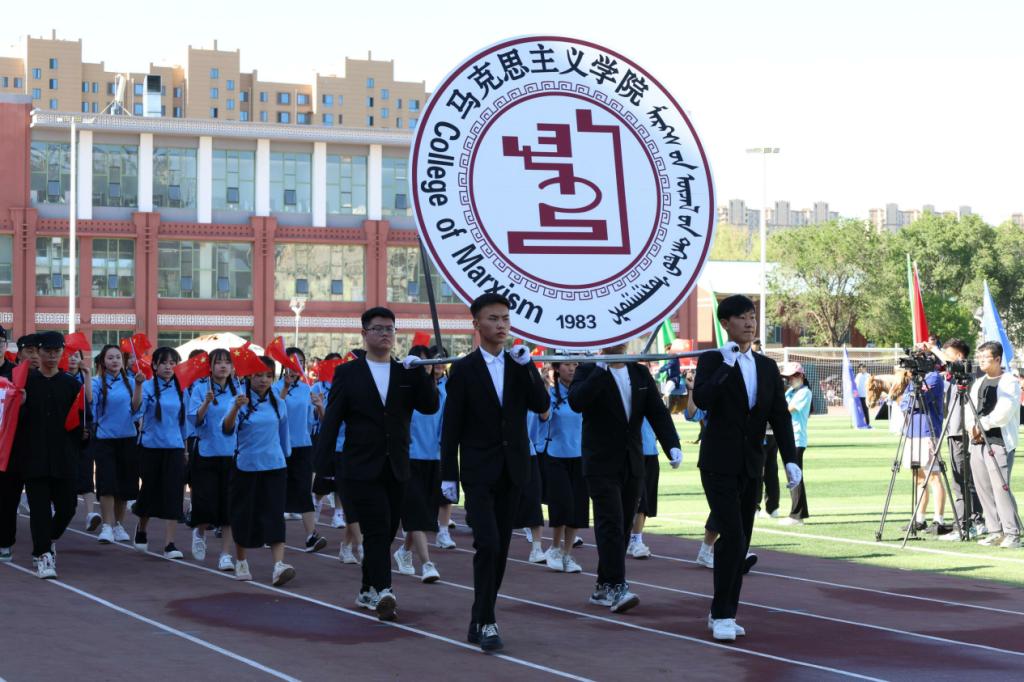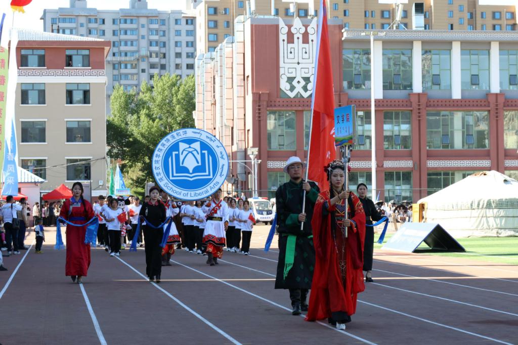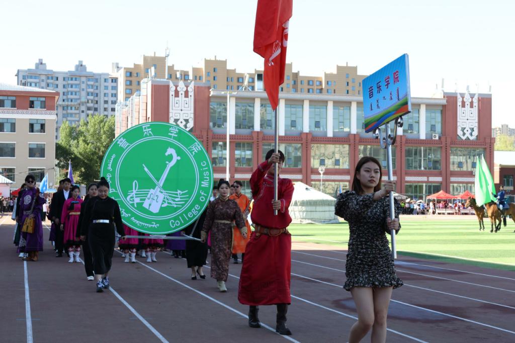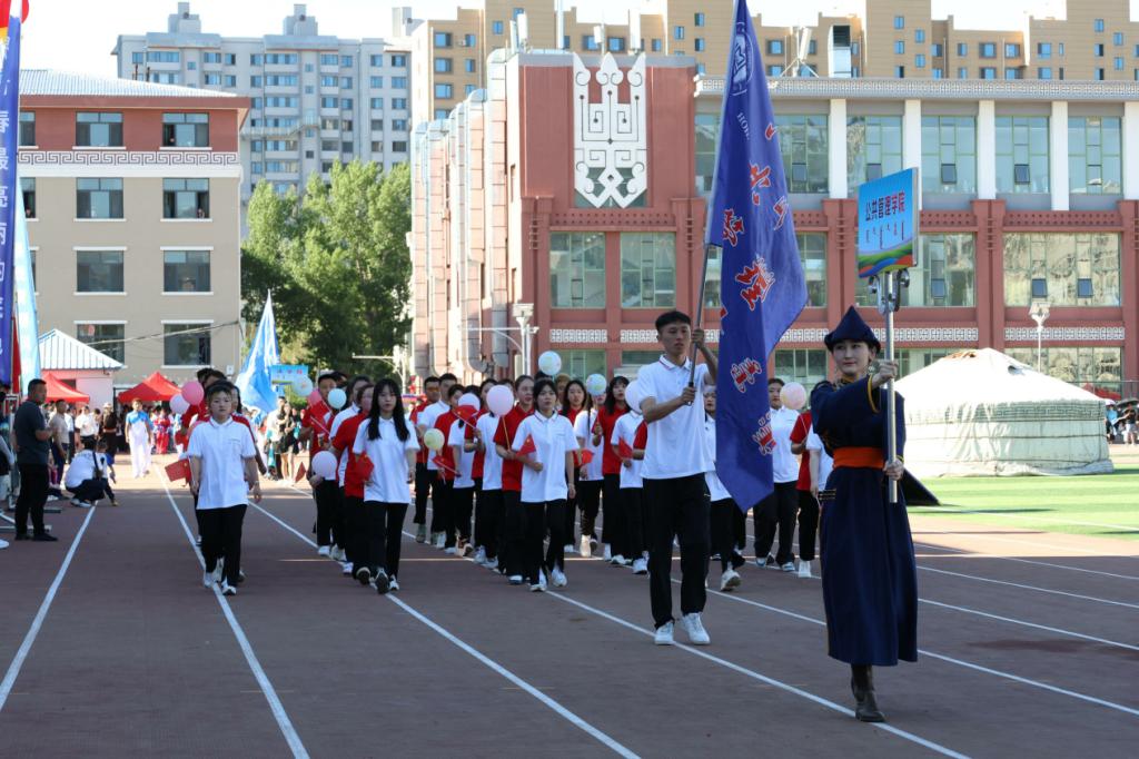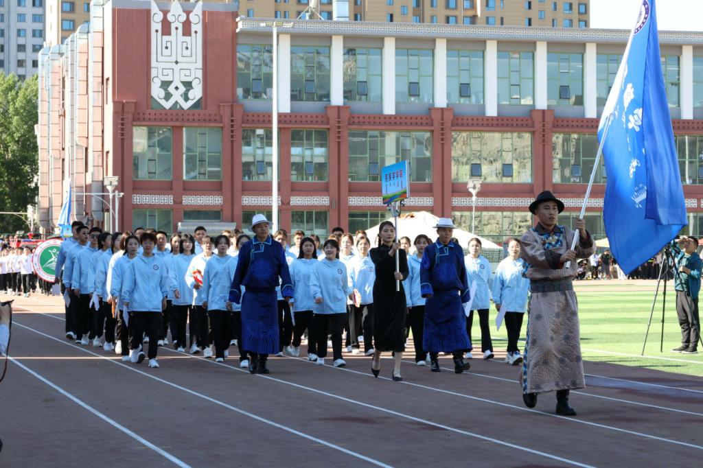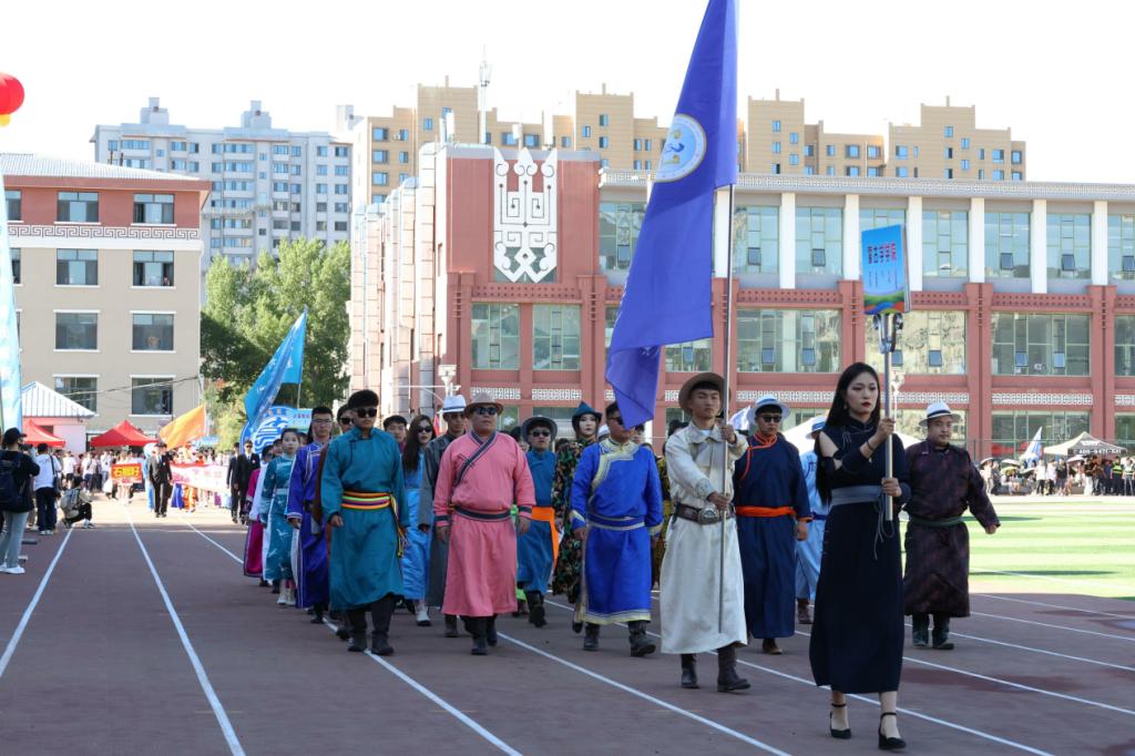 马背彩旗队、石榴籽小课堂方阵、传统武术队以及身着特色服装的搏克代表队、射箭代表队、布鲁代表队、喜塔尔代表队、蒙古象棋代表队、包根吉日格代表队、沙嘎哈日靶代表队、抢枢代表队等传统项目队和各学院代表方队依次入场。他们步伐健朗,整齐划一,喊着响亮的口号,充分展示了beat365官网师生积极向上的精神风貌。