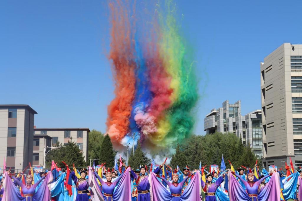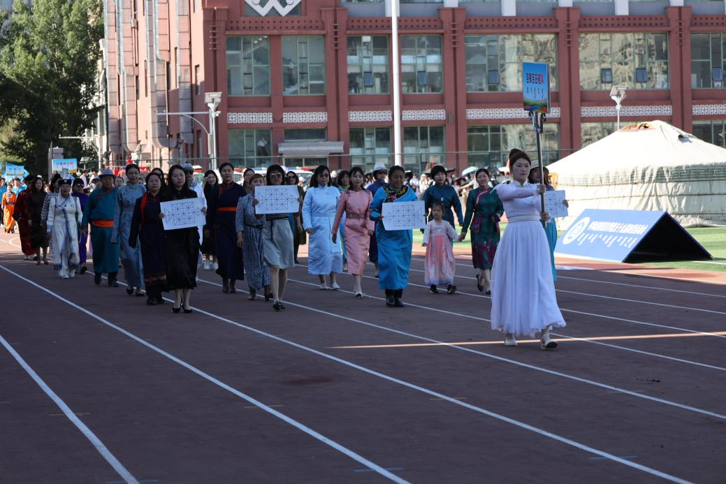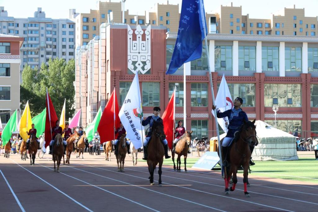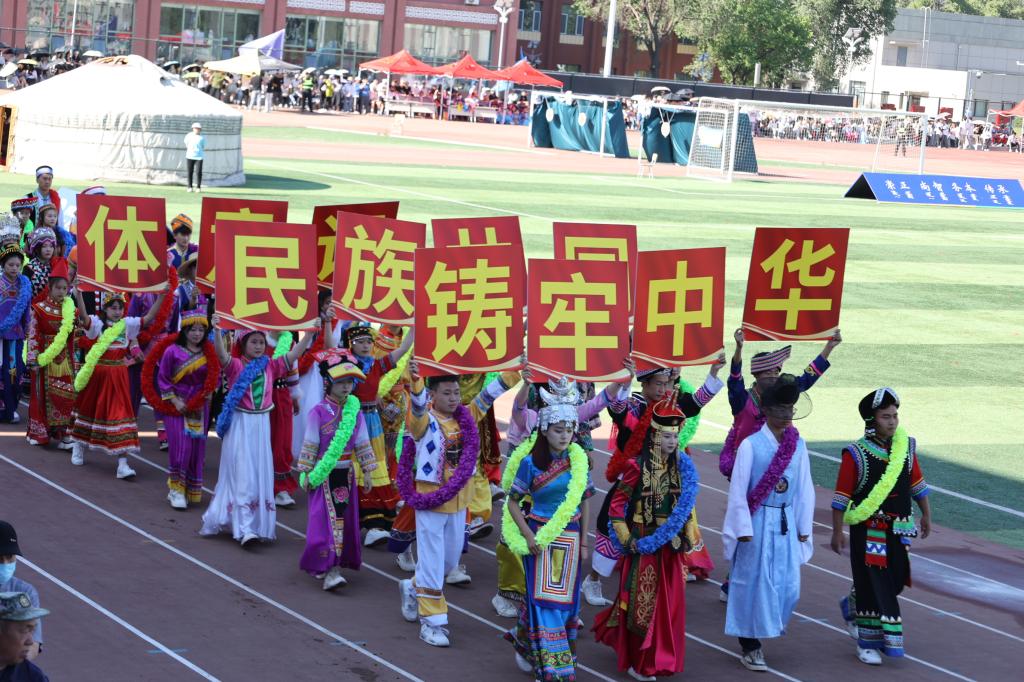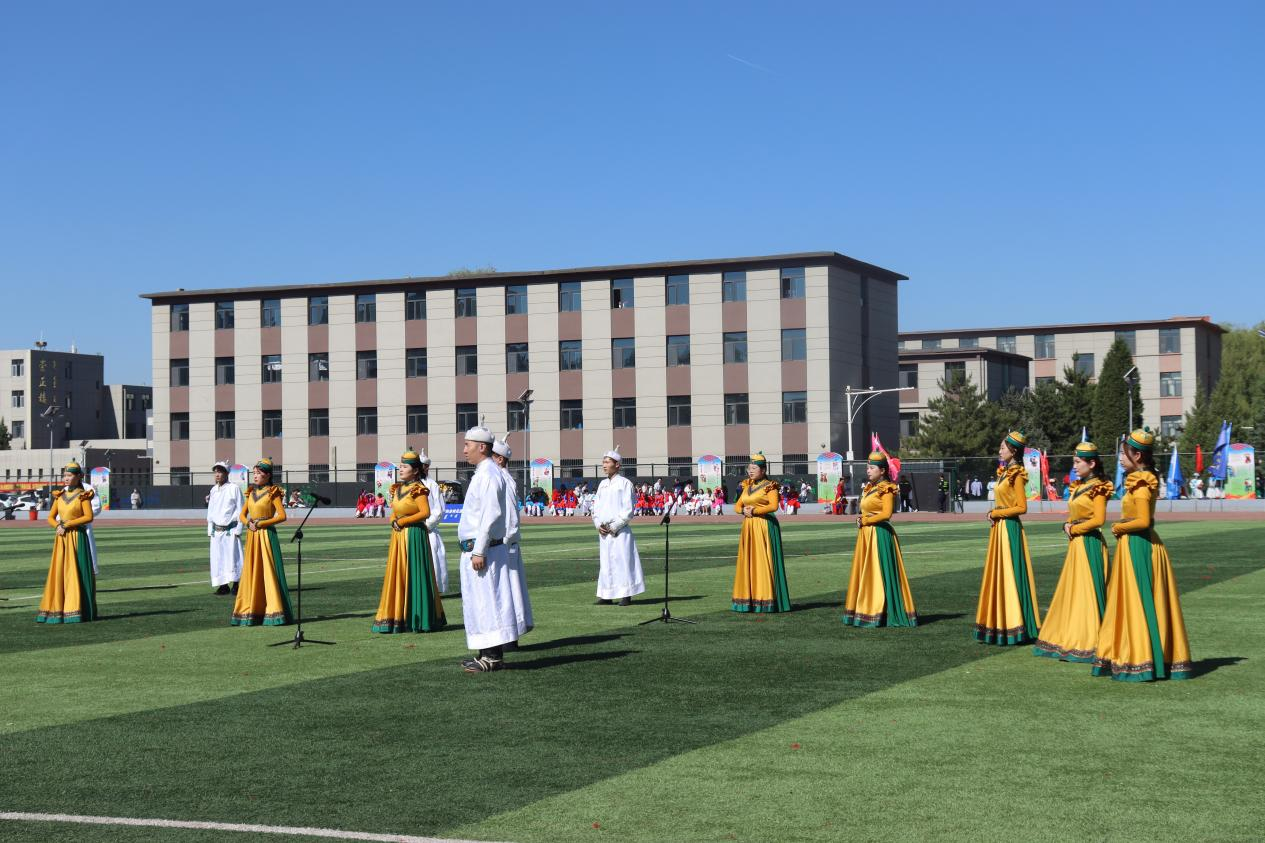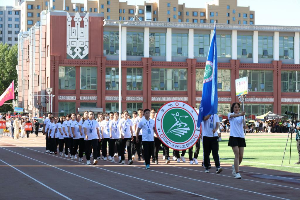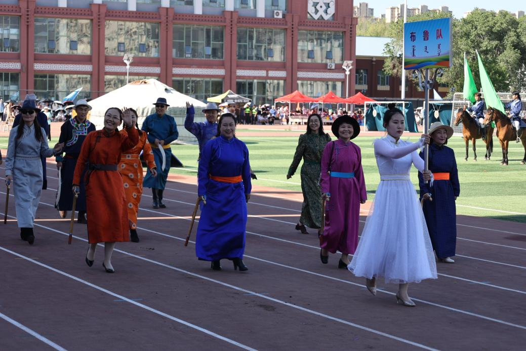 马背彩旗队、石榴籽小课堂方阵、传统武术队以及身着特色服装的搏克代表队、射箭代表队、布鲁代表队、喜塔尔代表队、蒙古象棋代表队、包根吉日格代表队、沙嘎哈日靶代表队、抢枢代表队等传统项目队和各学院代表方队依次入场。他们步伐健朗,整齐划一,喊着响亮的口号,充分展示了beat365官网师生积极向上的精神风貌。