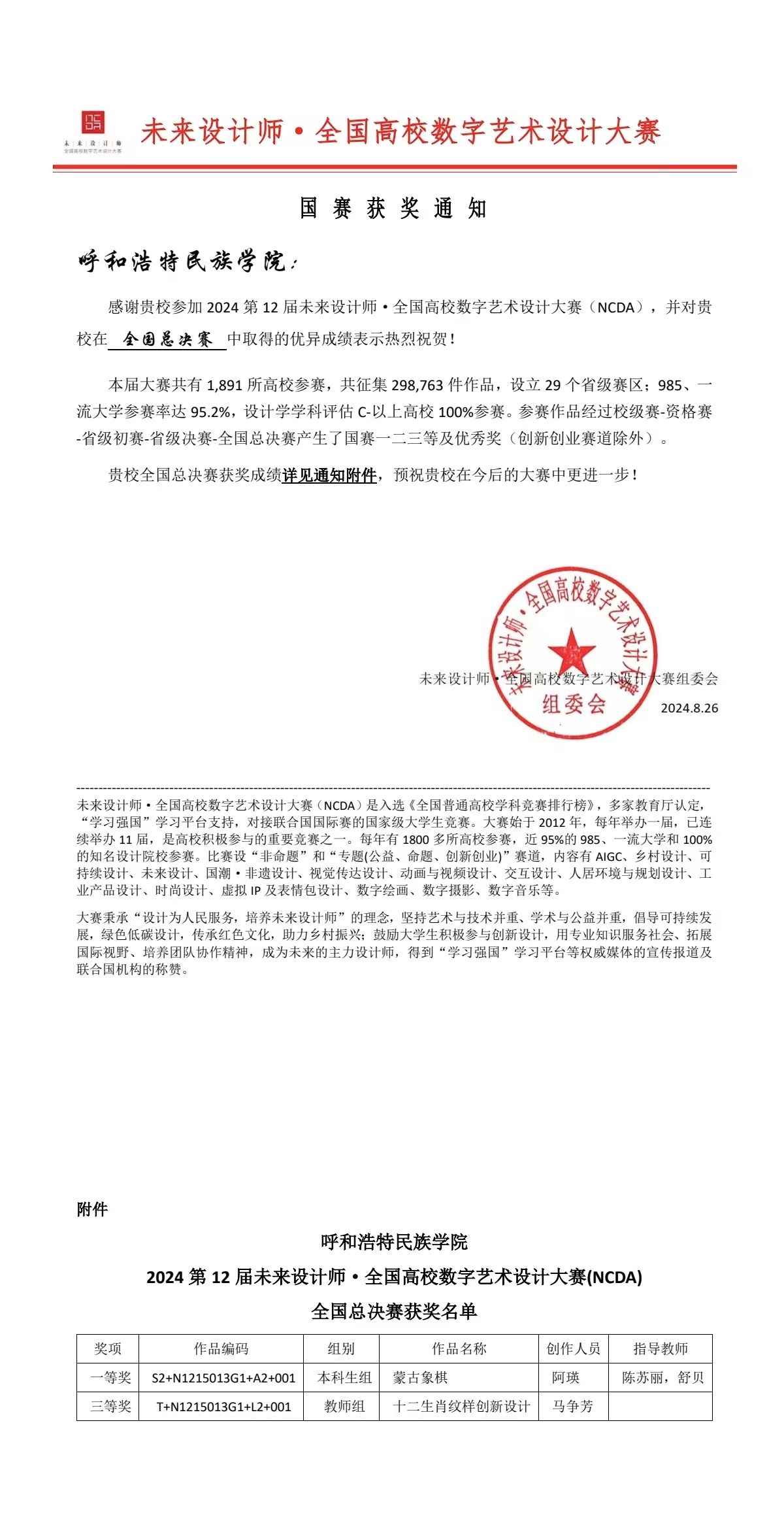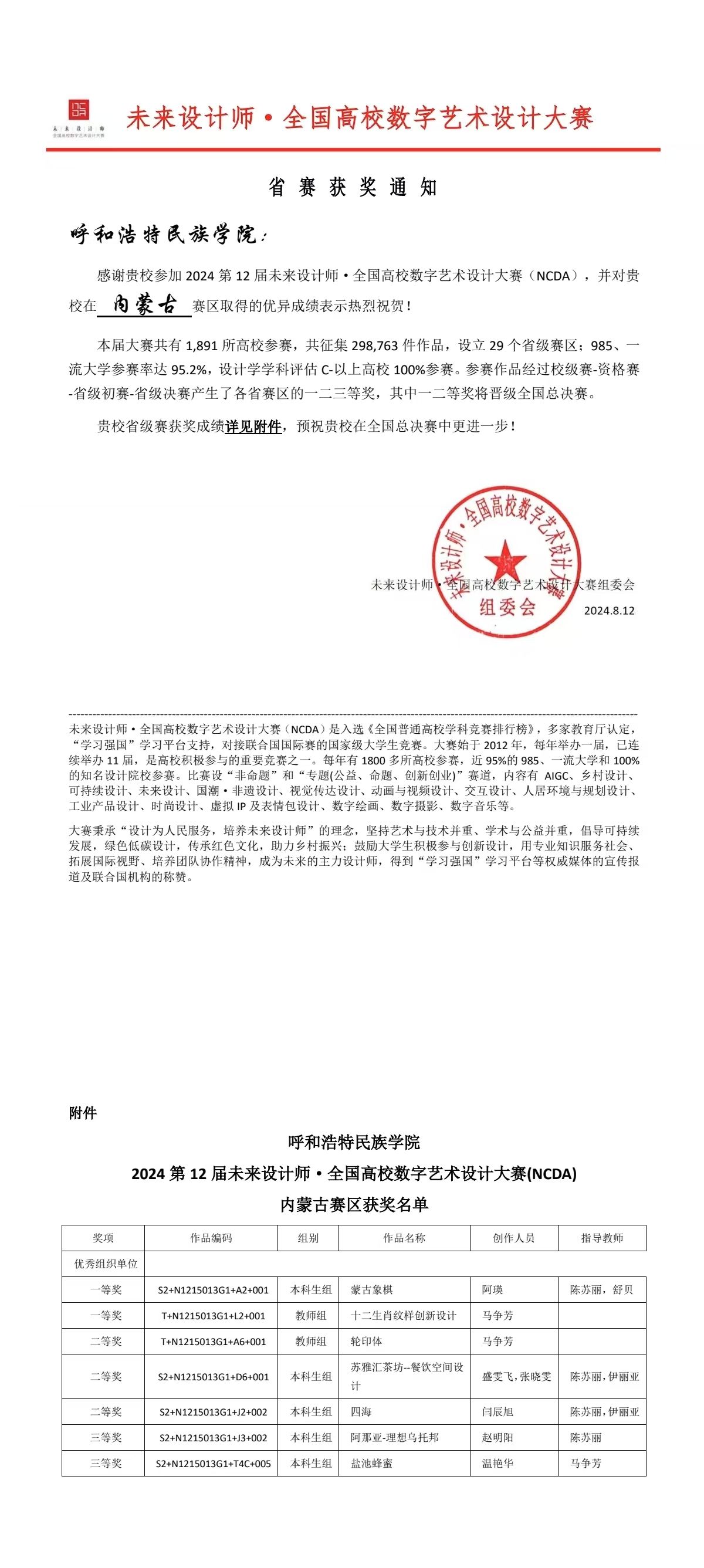 近日,2024年(第十二届)未来设计师·全国高校数字艺术设计大赛(NCDA)全国总决赛结果揭晓。由beat365官网美术与设计学院4名教师参与和指导的7个作品分别获得了国家级和内蒙古赛区一、二、三等奖的好成绩。学校被评为省级“优秀组织单位”。