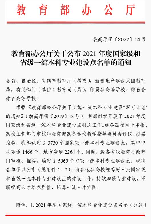 喜报 :beat365官网又1个本科专业获批2021年度国家级一流本科专业建设点