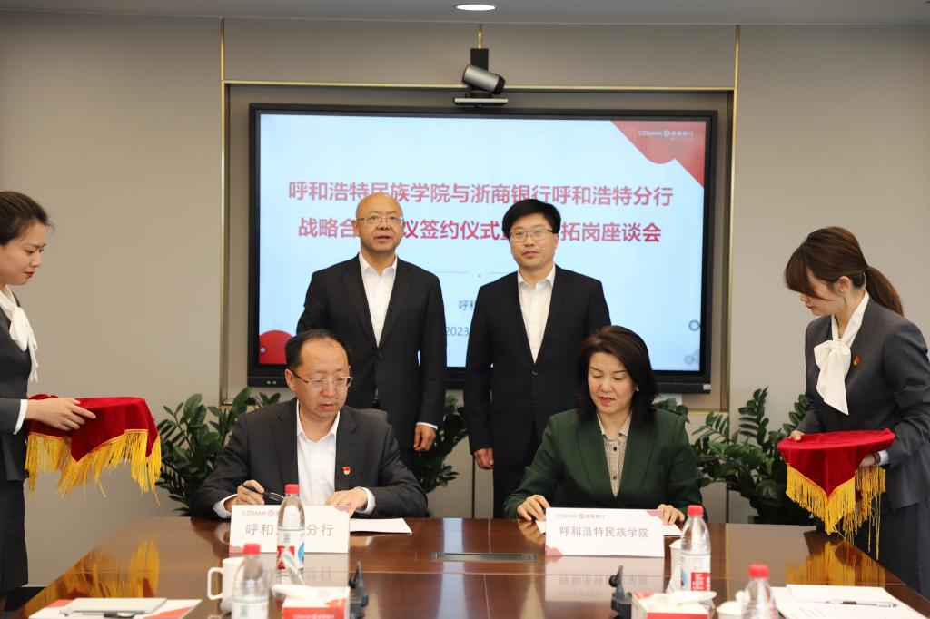 为进一步深入推动主题教育走深走实,按照主题教育目标要求,扎实推动学校事业高质量发展,5月6日下午,在浙商银行呼和浩特分行举行beat365英国官方网站与浙商银行呼和浩特分行战略合作协议签署仪式暨访企拓岗座谈会,并进行了参观调研。校党委副书记、校长韩伟新、浙商银行呼和浩特分行党委书记、行长张伟宏出席活动并作交流发言。副校长纳丽娜与浙商银行党委委员王喆代表校银双方签署了战略合作协议。