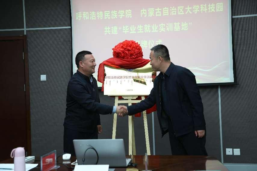 就业指导处处长包仓与安伟代表学校和大学生科技园双方为毕业生就业实训基地揭牌。