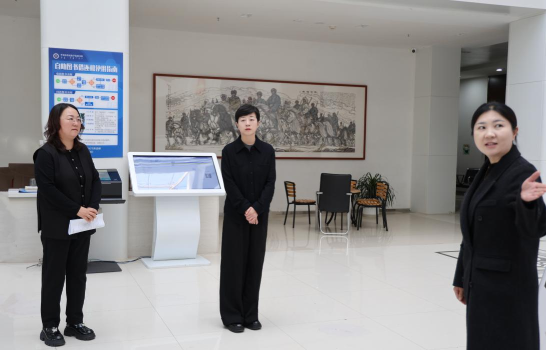 调研图书馆工作时,王敏深入图书馆各楼层了解文献资源管理、空间利用效能及信息化基础设施运行状况,并与一线馆员、读者亲切交流,听取关于资源使用、服务体验等方面的意见建议。座谈会上,王敏充分肯定了图书馆在服务学科建设、教学科研和人才培养方面发挥的积极作用。她要求,图书馆要持续发挥职能职责,为学校文献信息保障与学术服务提供坚实支撑。要坚持正确导向,严守意识形态主阵地;要聚焦能力提升,加强专业馆员队伍建设;要优化资源配置,提升文献建设精准度;要夯实技术基础,保障数字服务安全稳定;要强化宣传推广,切实提高资源利用效能。图书馆馆长郝喜凤就现阶段工作成效和下一步工作计划作了汇报。