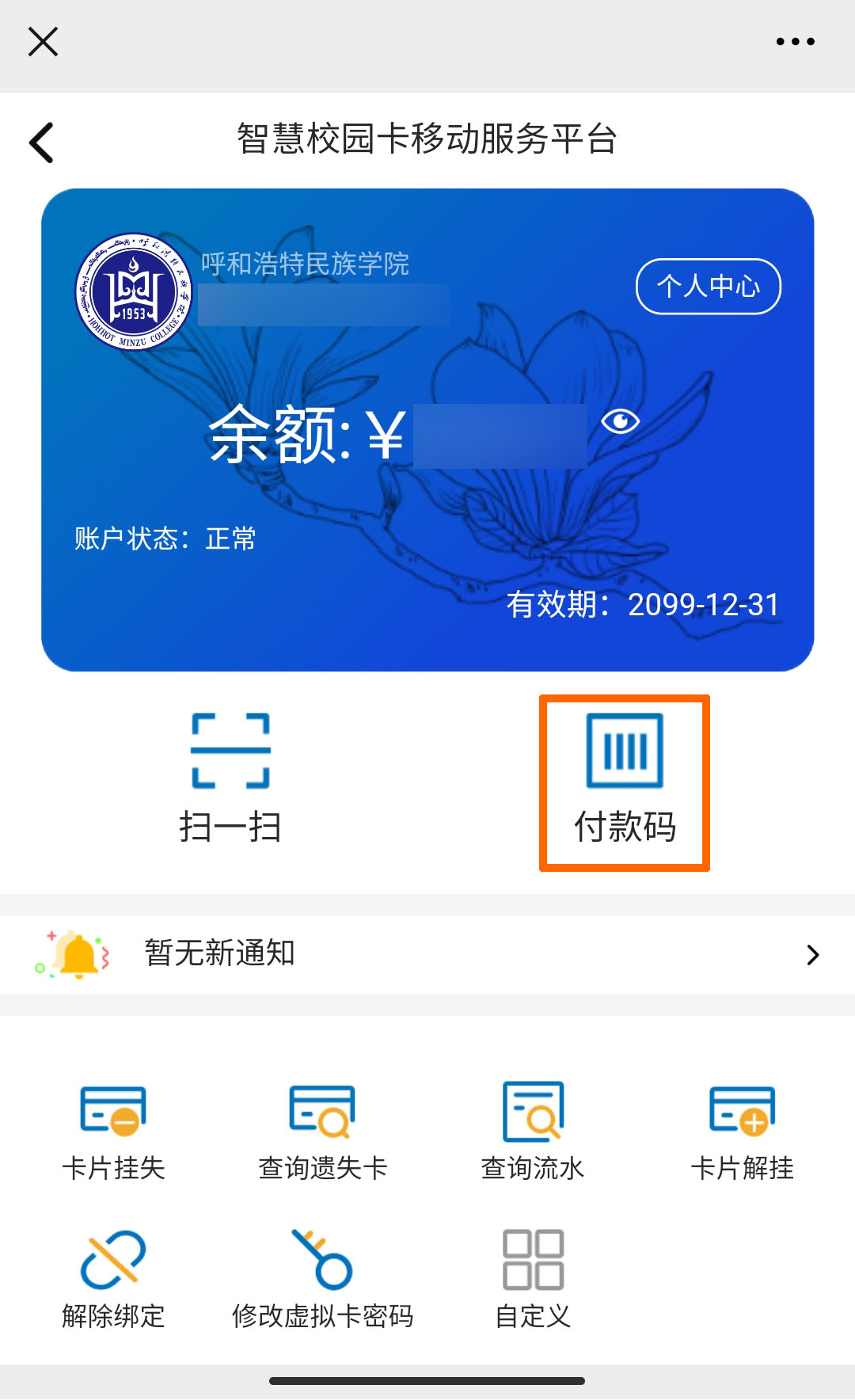 校本部校园卡管理中心:0471-6586130(内线6130)。