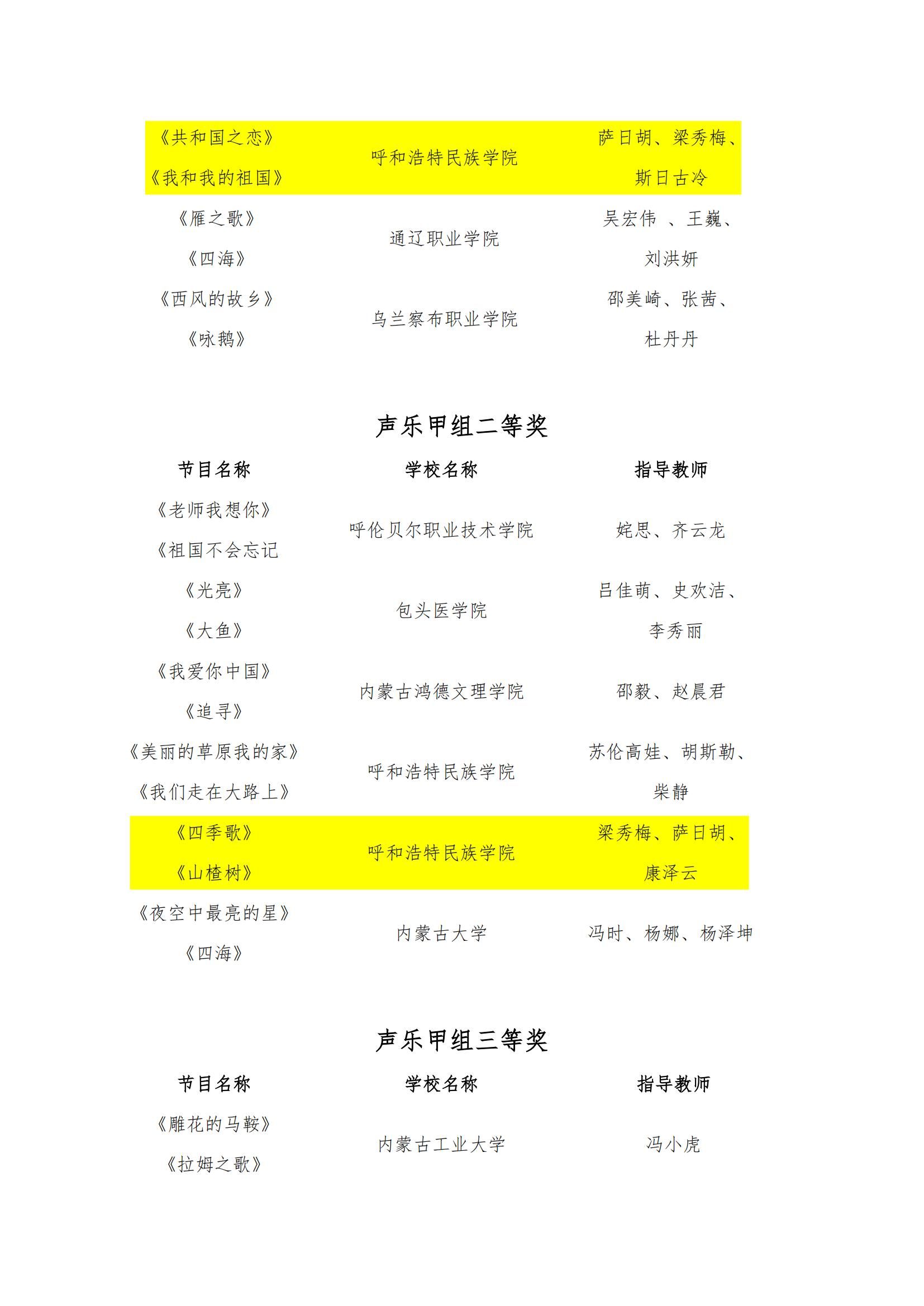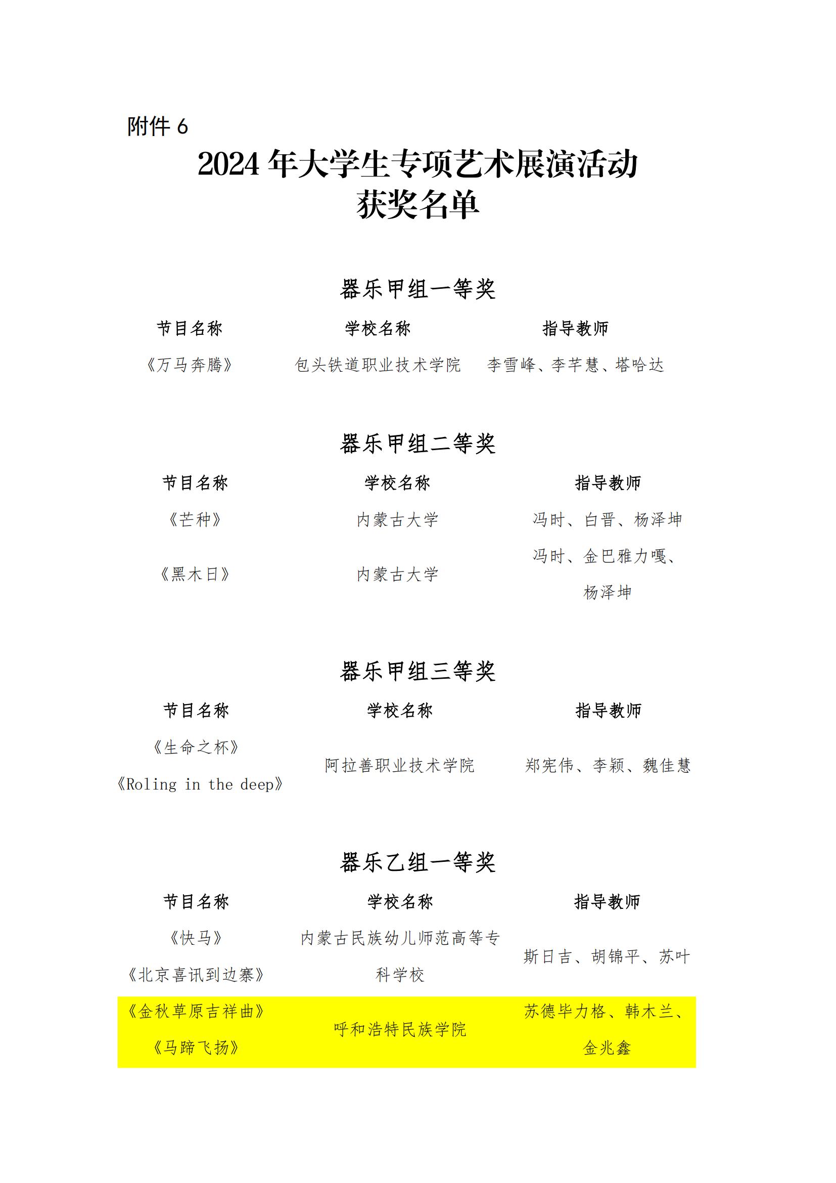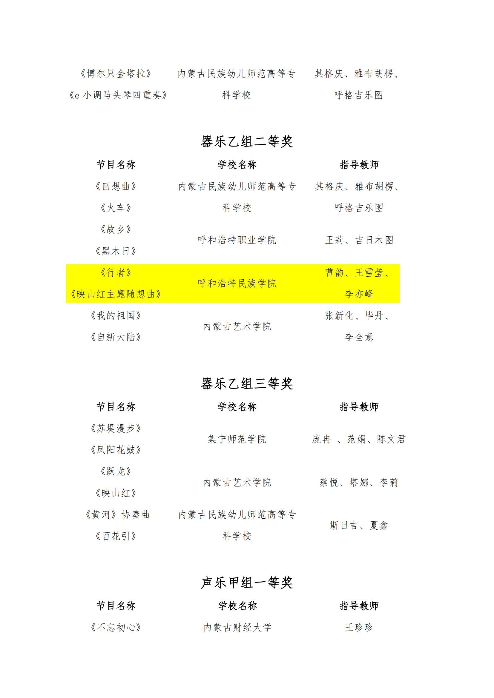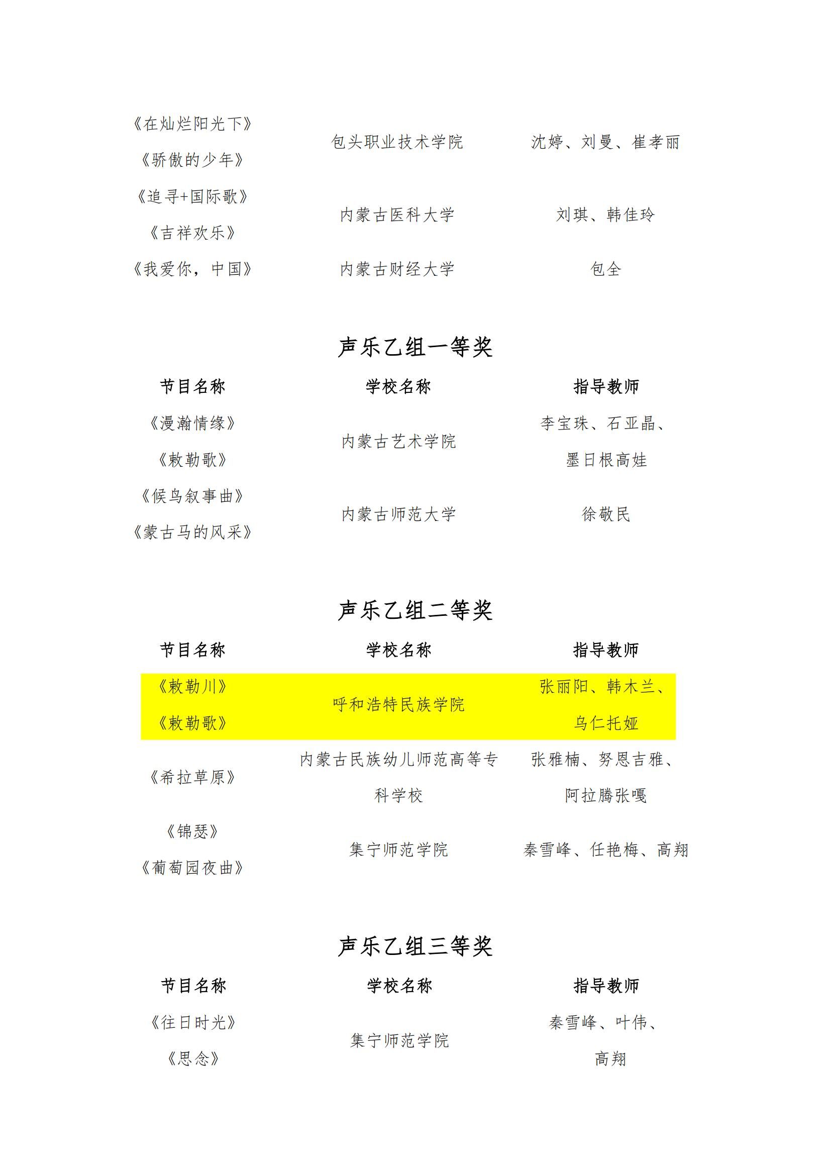 我院教师苏德毕力格、韩木兰、金兆鑫指导的《金秋草原吉祥曲》《马蹄飞扬》作品荣获大学生专项艺术展演活动器乐乙组一等奖;曹韵、王雪莹、李亦峰指导的《行者》《映山红主题随想曲》荣获器乐乙组二等奖;梁秀梅参与指导的《共和国之恋》《我和我的祖国》荣获声乐甲组一等奖,《四季歌》《山楂树》荣获声乐甲组二等奖;张丽阳、韩木兰、乌仁托娅指导的《敕勒川》《敕勒歌》荣获声乐乙组二等奖。取得了beat365官网在全区艺术类展演活动上的新突破。