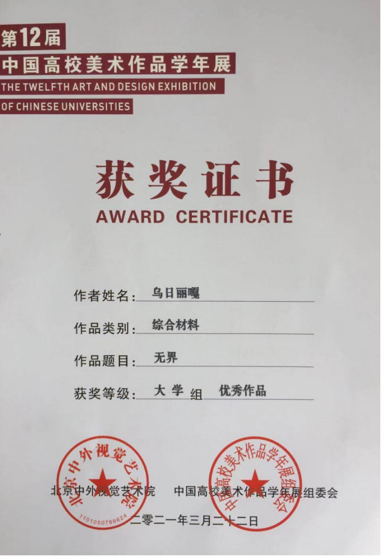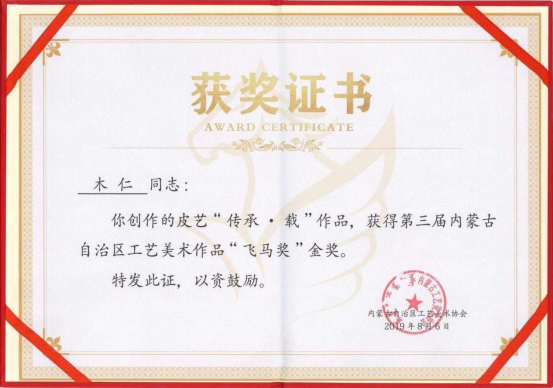 2019年6月作品(合作)《传承.载》“第三届内蒙古自治区工艺美术品飞马奖”获金奖,原作被内蒙古美术馆永久收藏。