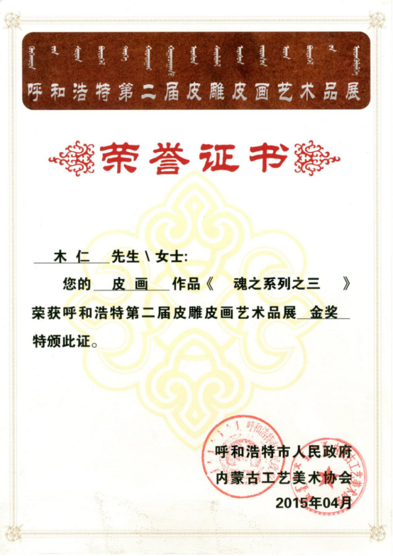 2015年1月作品《魂系列之二》获《呼和浩特第二届皮雕皮画艺术品展览》金奖。