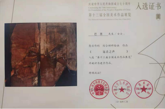 6.综合材料绘画“远古之声”被评为第十三届全国美术展览进京作品,荣获第三届中国美术奖获奖提名。荣获内蒙古首届美术奖银奖。(2019年)