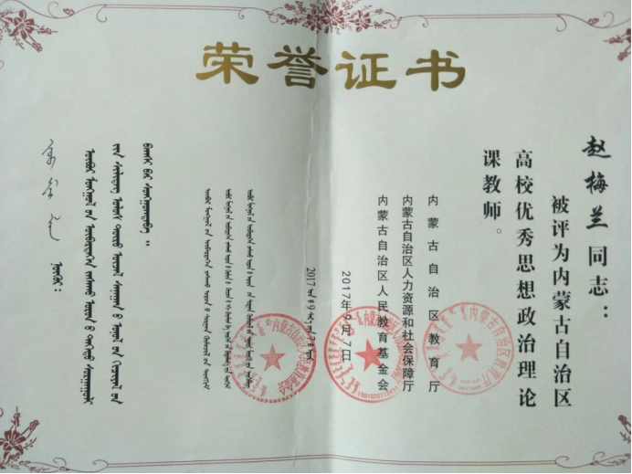 赵梅兰老师获得自治区优秀思政课教师荣誉