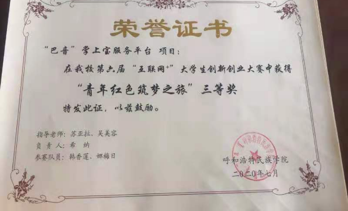 2018级希纳同学获得2020年度校级大学生创新创业大赛三等奖