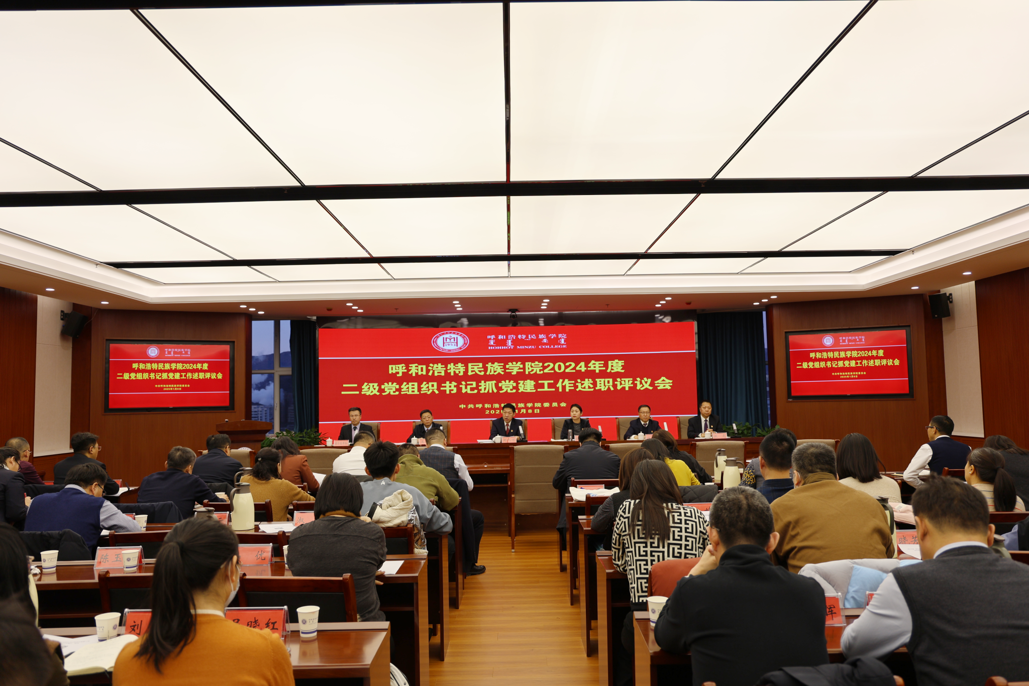 1月8日,学校召开2024年度二级党组织书记抓党建工作述职评议会议,校党委书记刘九万主持会议并作点评讲话。在家校领导班子成员出席会议,各职能部门负责人、二级党组织班子成员、两代表一委员、师生代表参加。