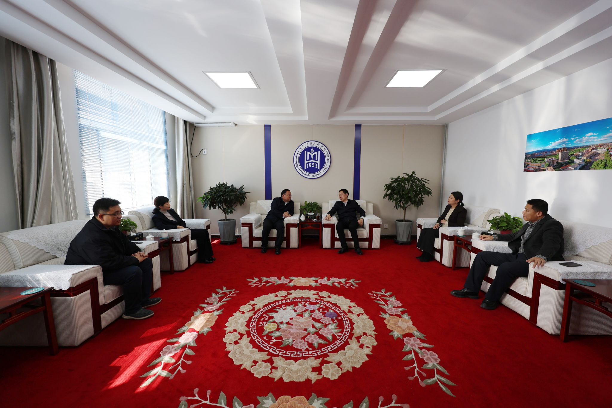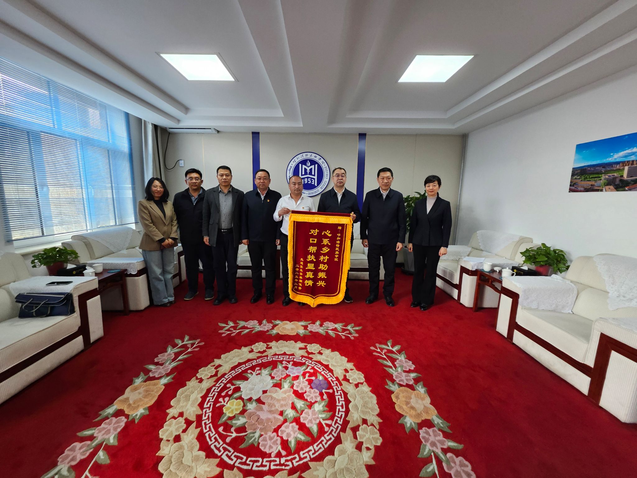 3月31日,beat365官网乡村振兴包联点库伦旗先进苏木党委书记乔宪坤一行来校交流座谈并就乡村振兴包联帮扶相关事宜进行对接洽谈。校党委书记刘九万,党委副书记、校长王敏,党委副书记格根哈斯出席了座谈会。